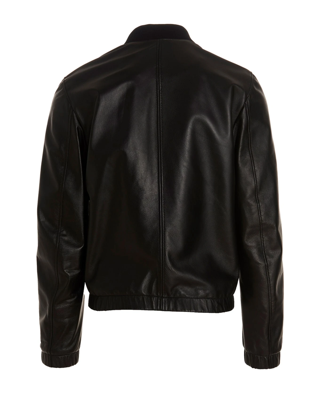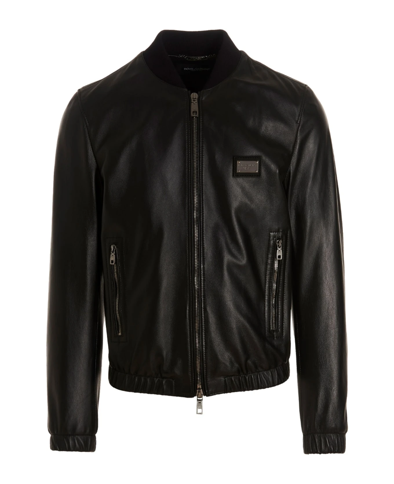 Bomber ‘DG Essential’ in pelle con colletto in maglia, chiusura zip, tasche, manica lunga con polsino elastico, fondo elastico, placca logo frontale.