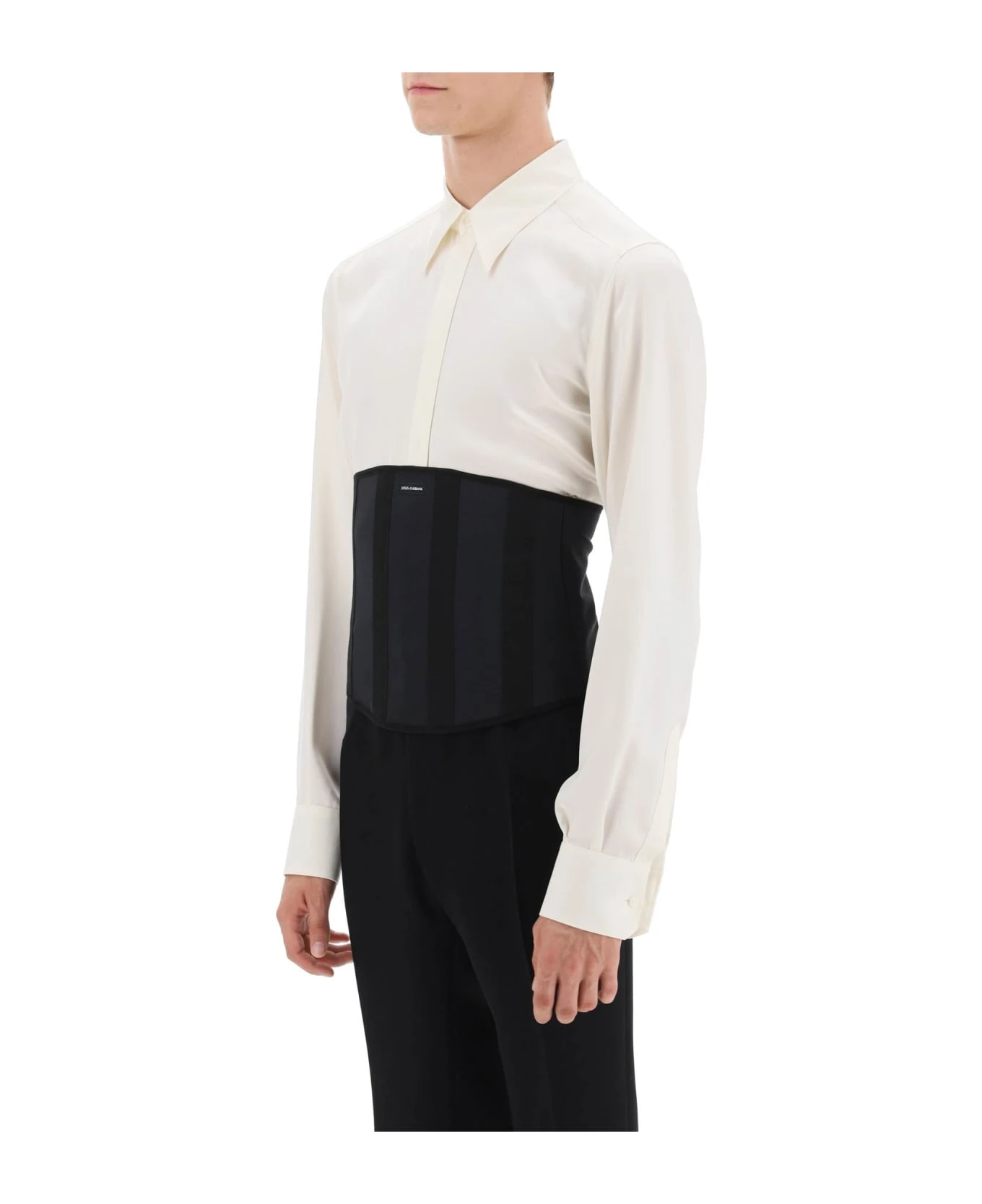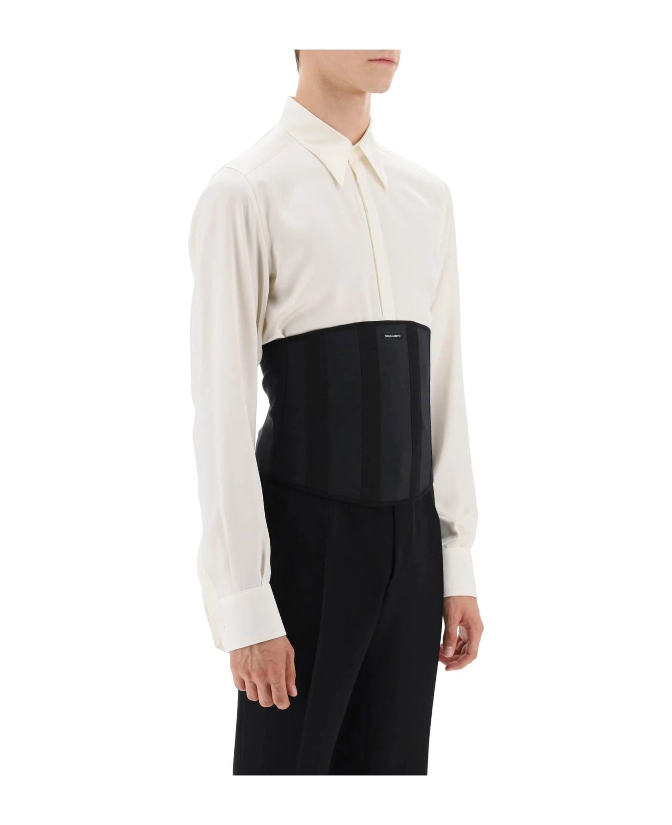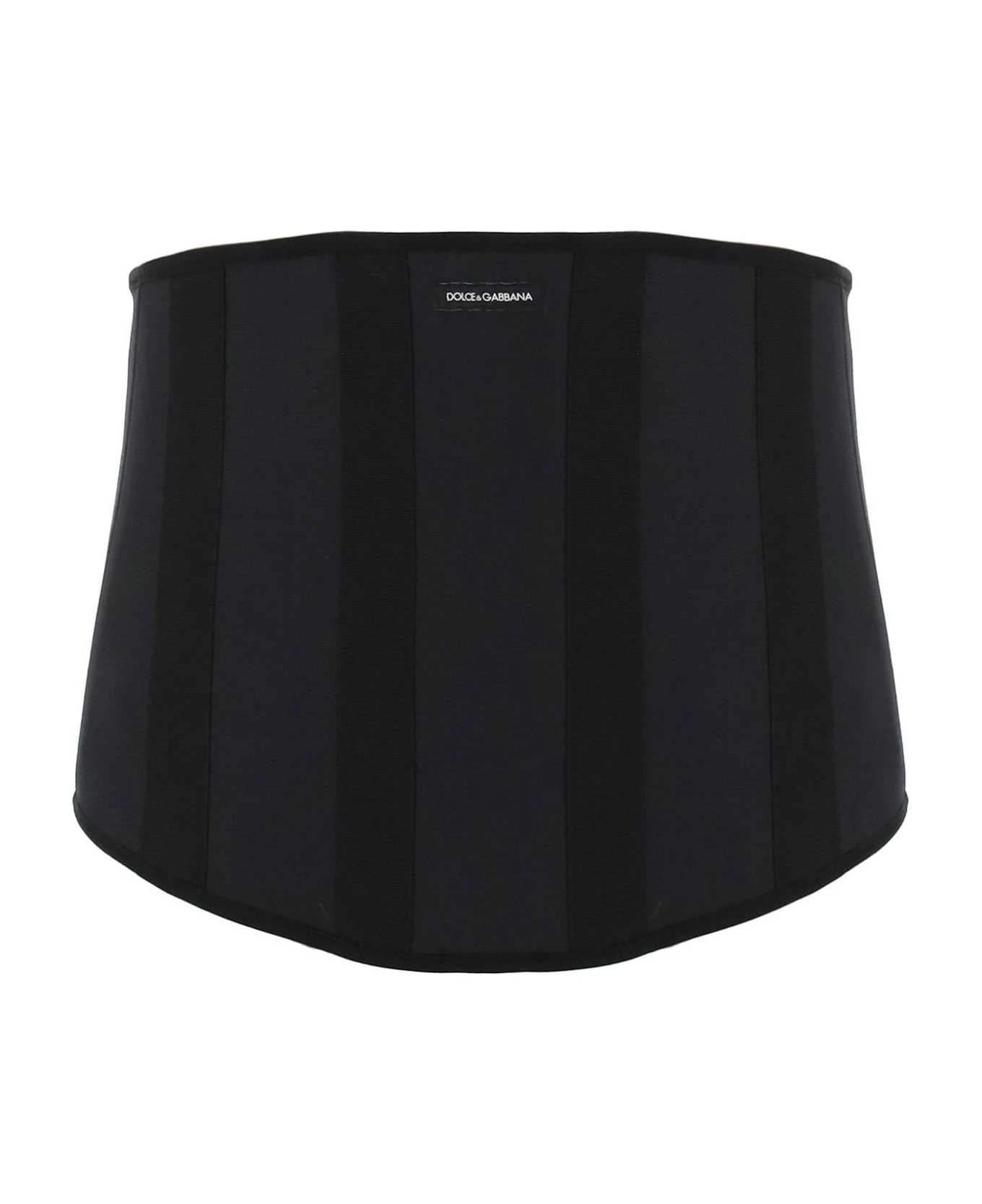 Dolce & Gabbana marquisette bustier enriched by grosgrain-covered boning and a front logo label. Adjustable hook-and-loop back closure. The model is 187 cm tall and wears a size IT 48.
