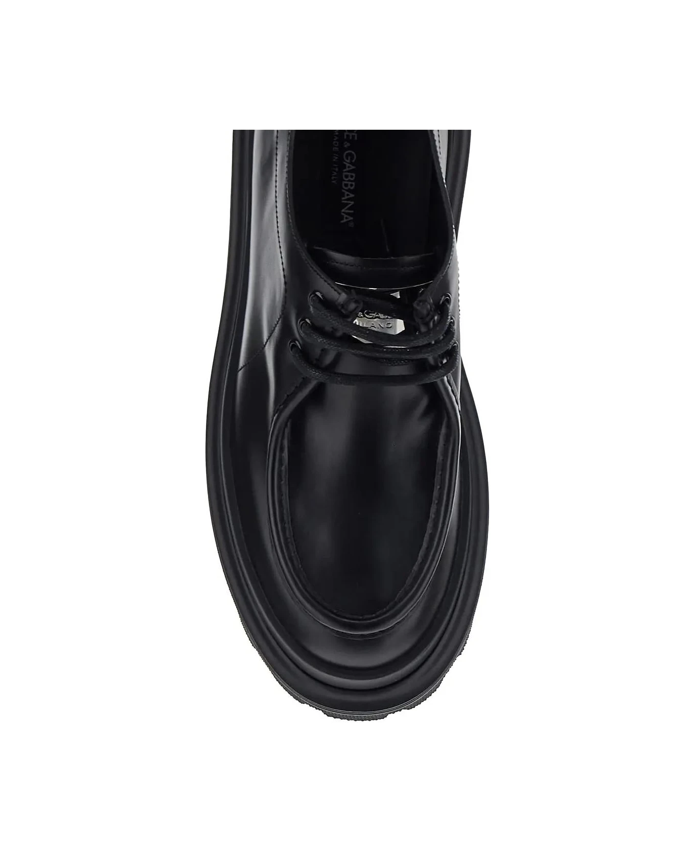 Dolce & Gabbana Derby shoes in black brushed leather with lace-up fastening, a ruthenium finish branded plaque on the tongue, embossed lug platform sole, a round toe, tonal topstitched details and a logo patch on the insole.