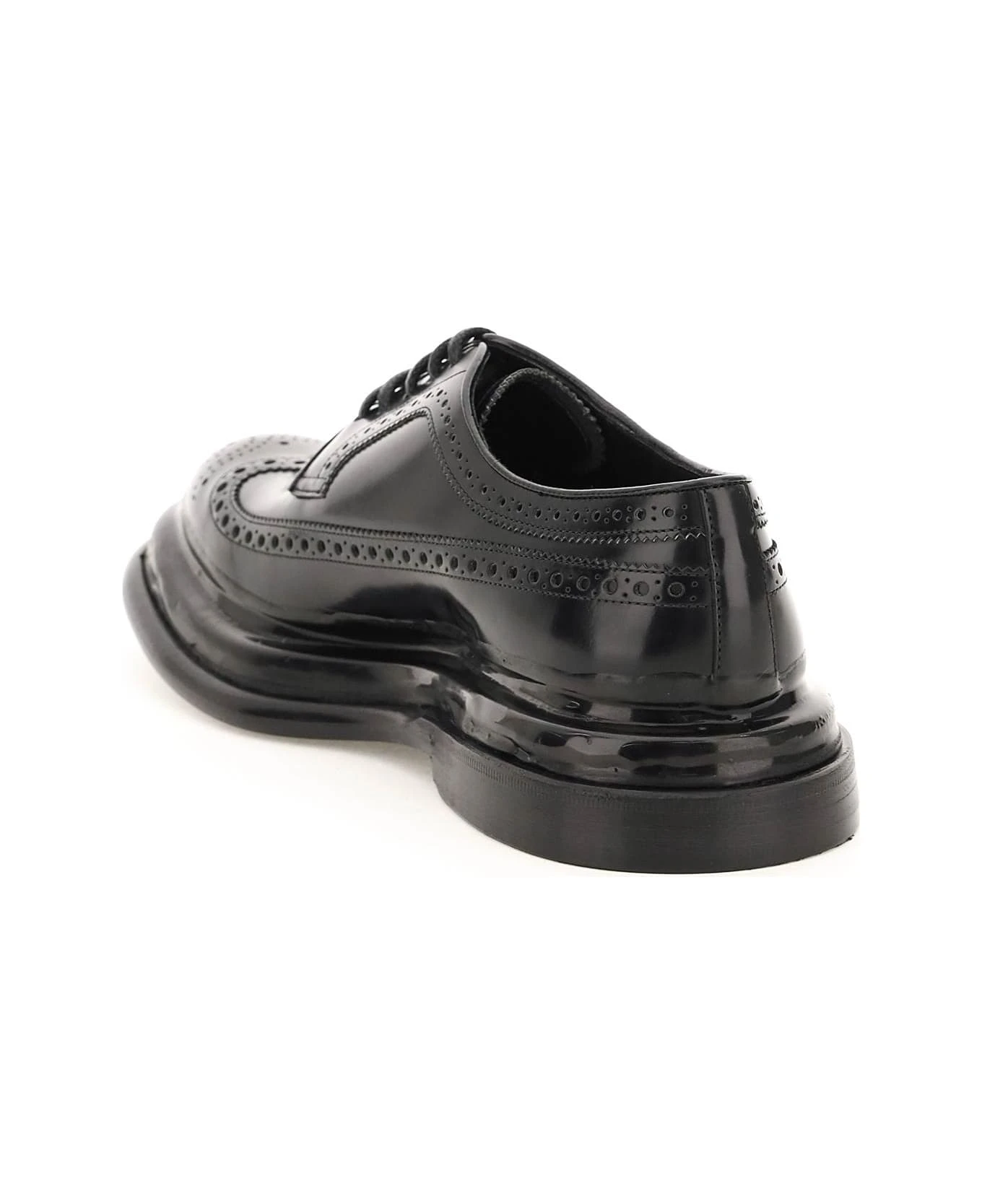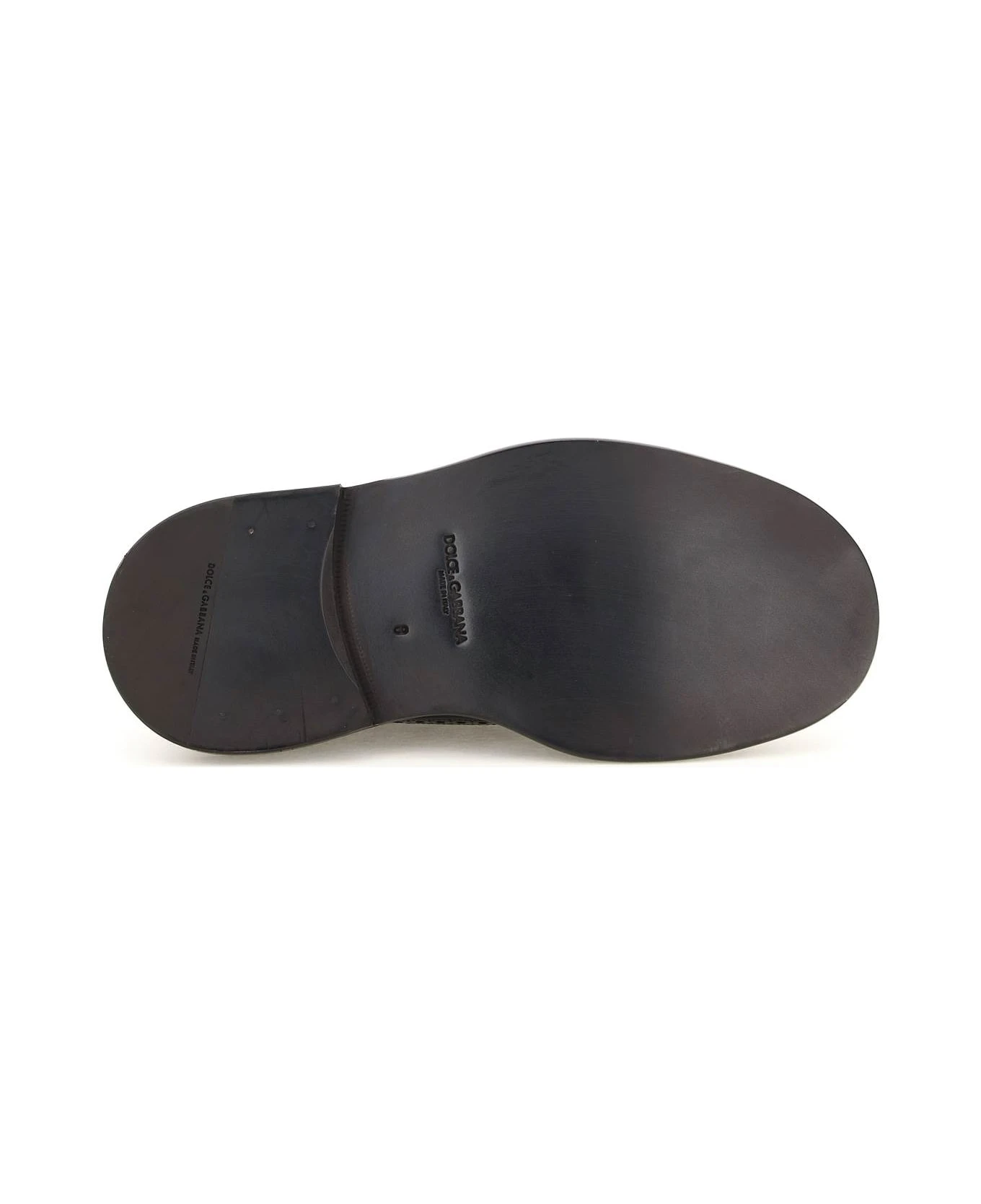 Phenomenal Derby shoes by Dolce & Gabbana crafted in brushed leather with brogue detailing and tone-on-tone melted detail on the base. Waxed laces, leather lining with quilted satin insert on the insole, leather sole with rubber inlay on the heel. Spare laces included.