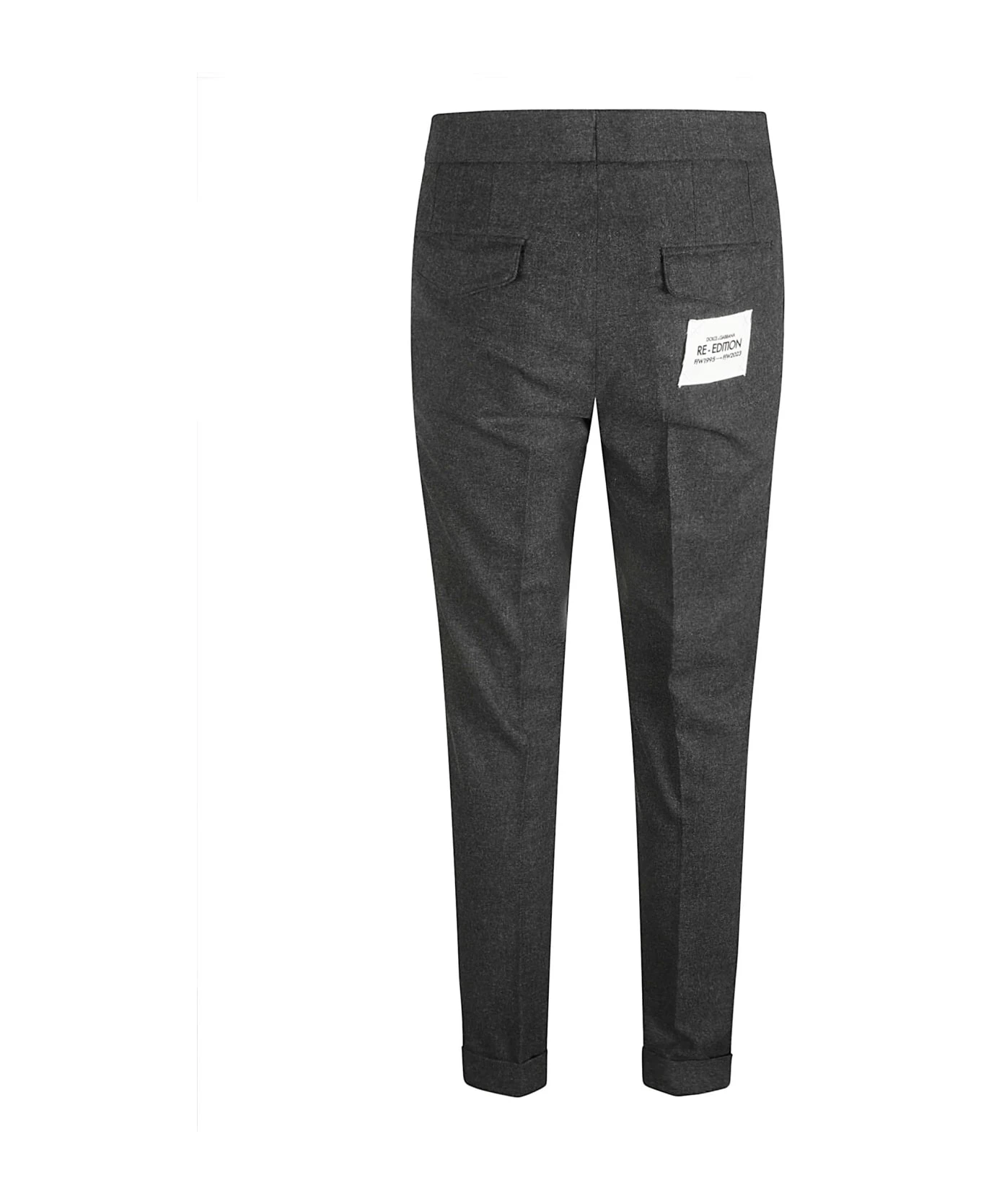 pressed-crease tailored trousers from DOLCE & GABBANA featuring dark grey, logo patch to the rear, concealed fly and button fastening, pressed crease, front flap pocket, two side slit pockets, two rear flap pockets, belt loops, turn-up hem and tailored cut.