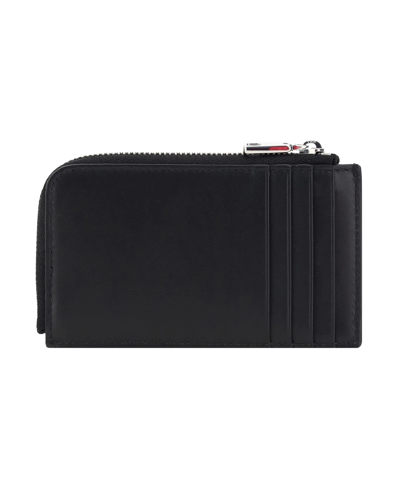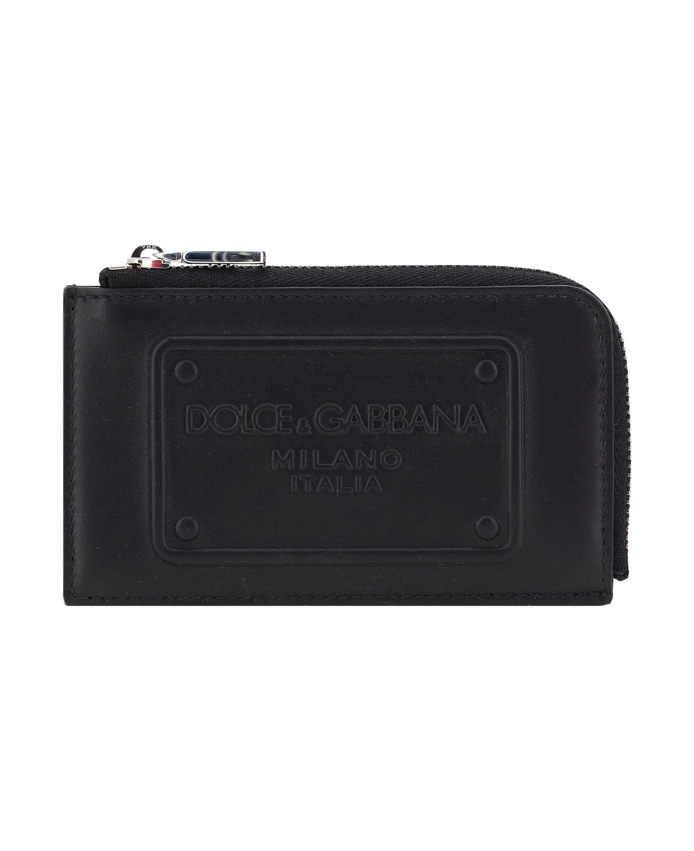 Calfskin card case by dolce&gabbana, coin compartment with top zipper closure, card slot on back, iconic d&g brand monogram embossed on front.