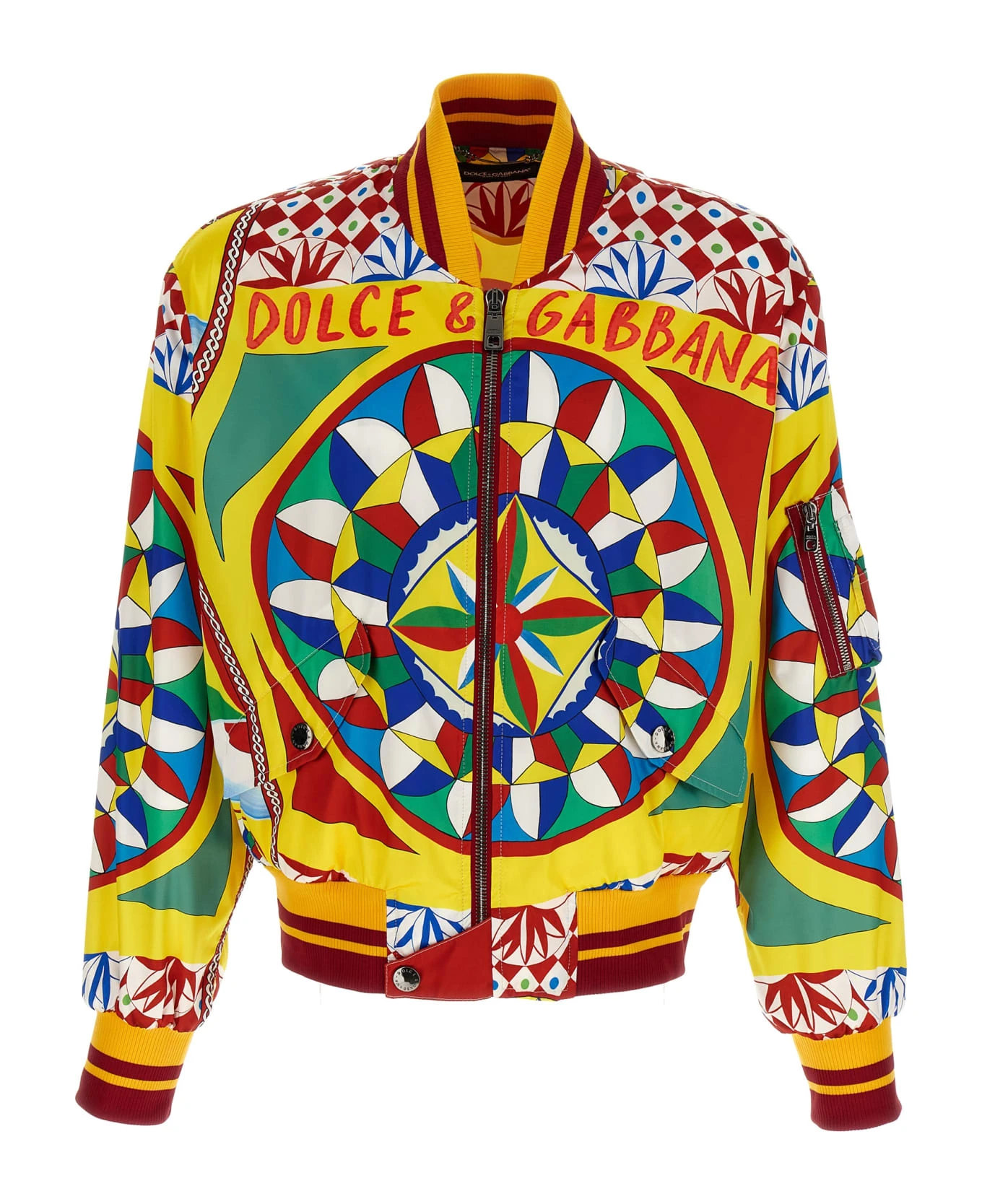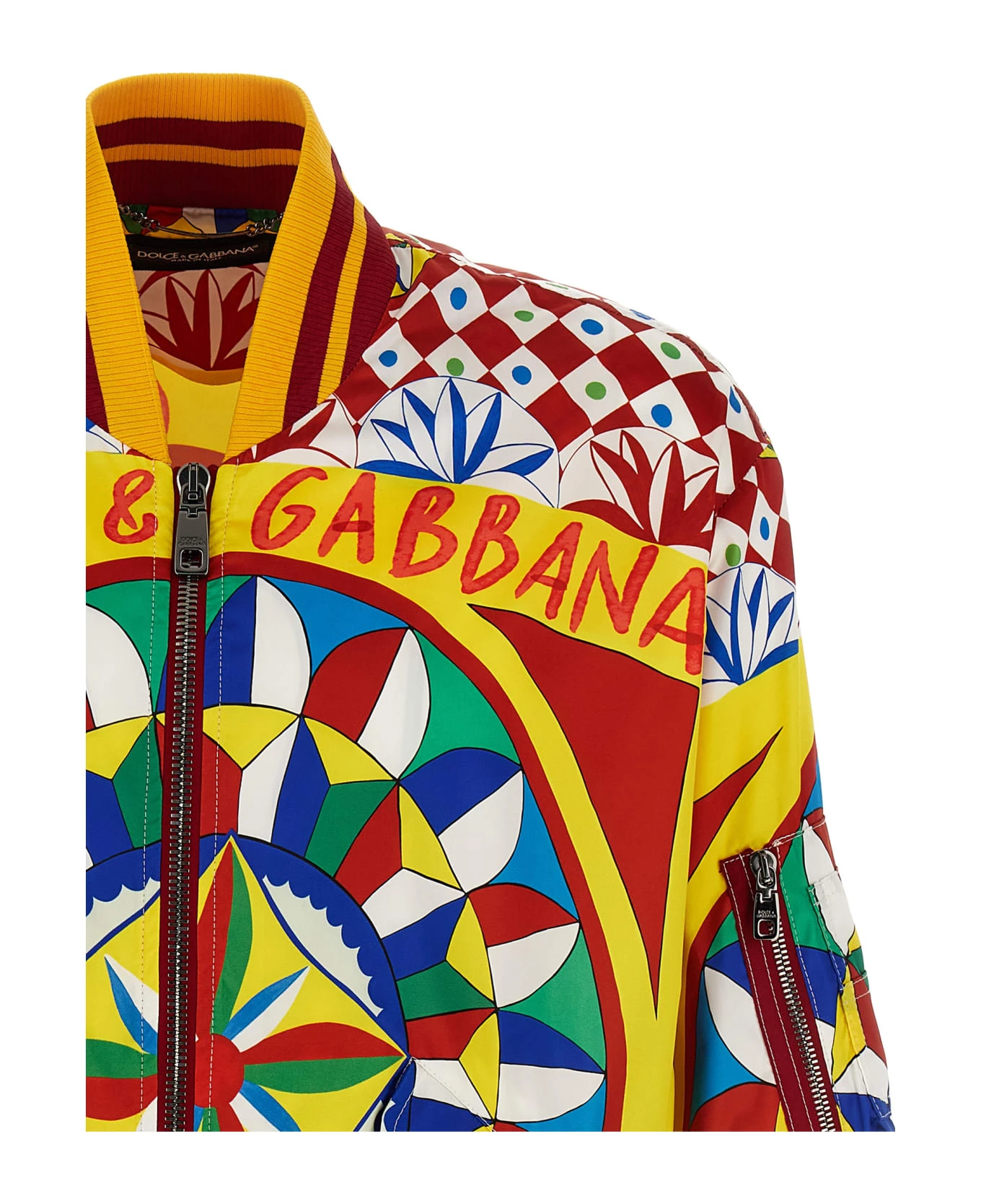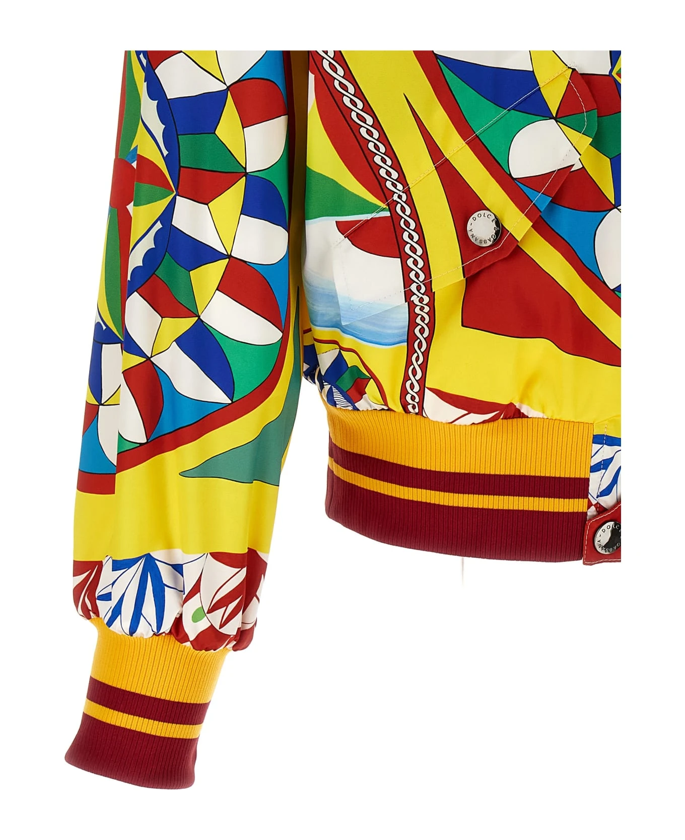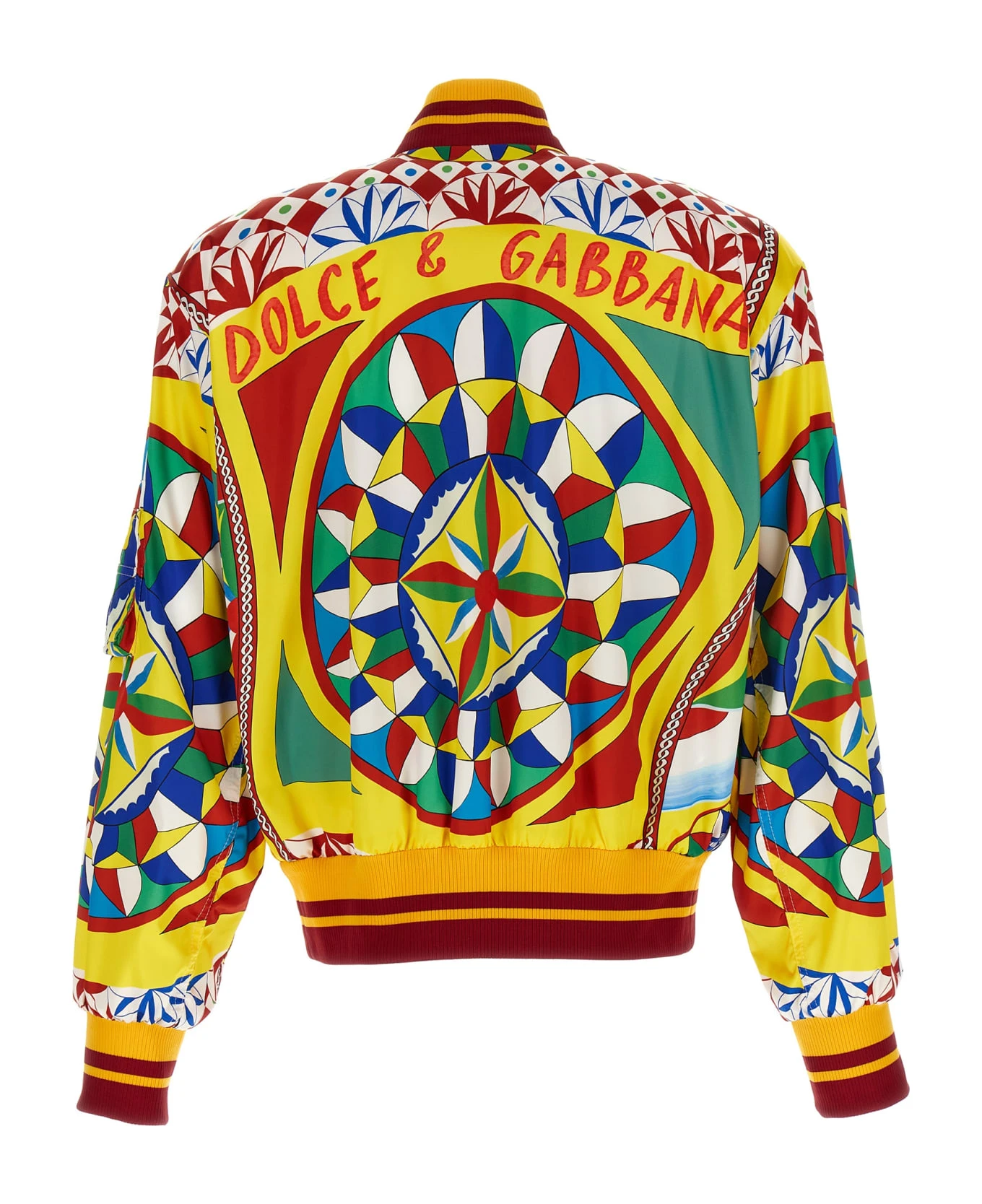 ‘Carretto’ print satin bomber jacket with zip closure, pockets, and long knitted cuffed sleeves.