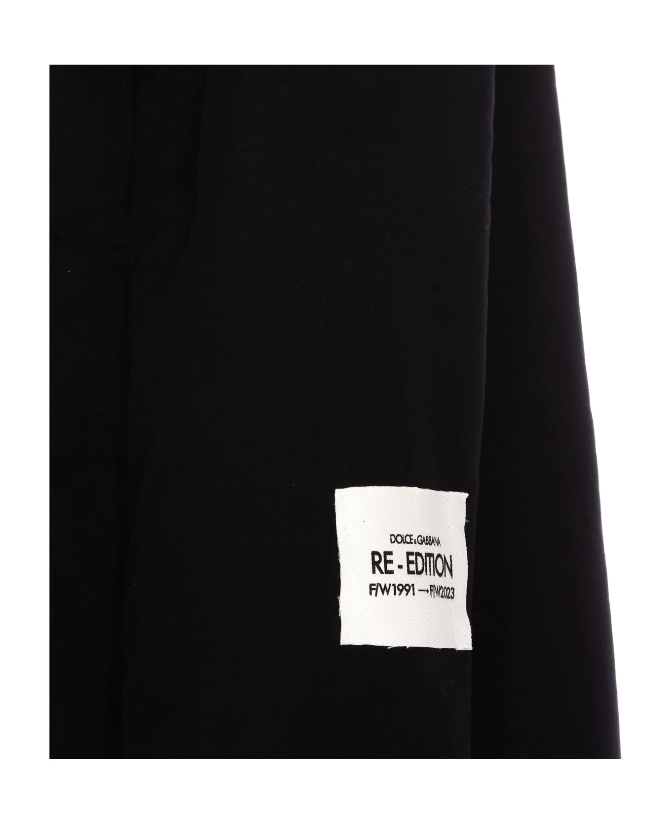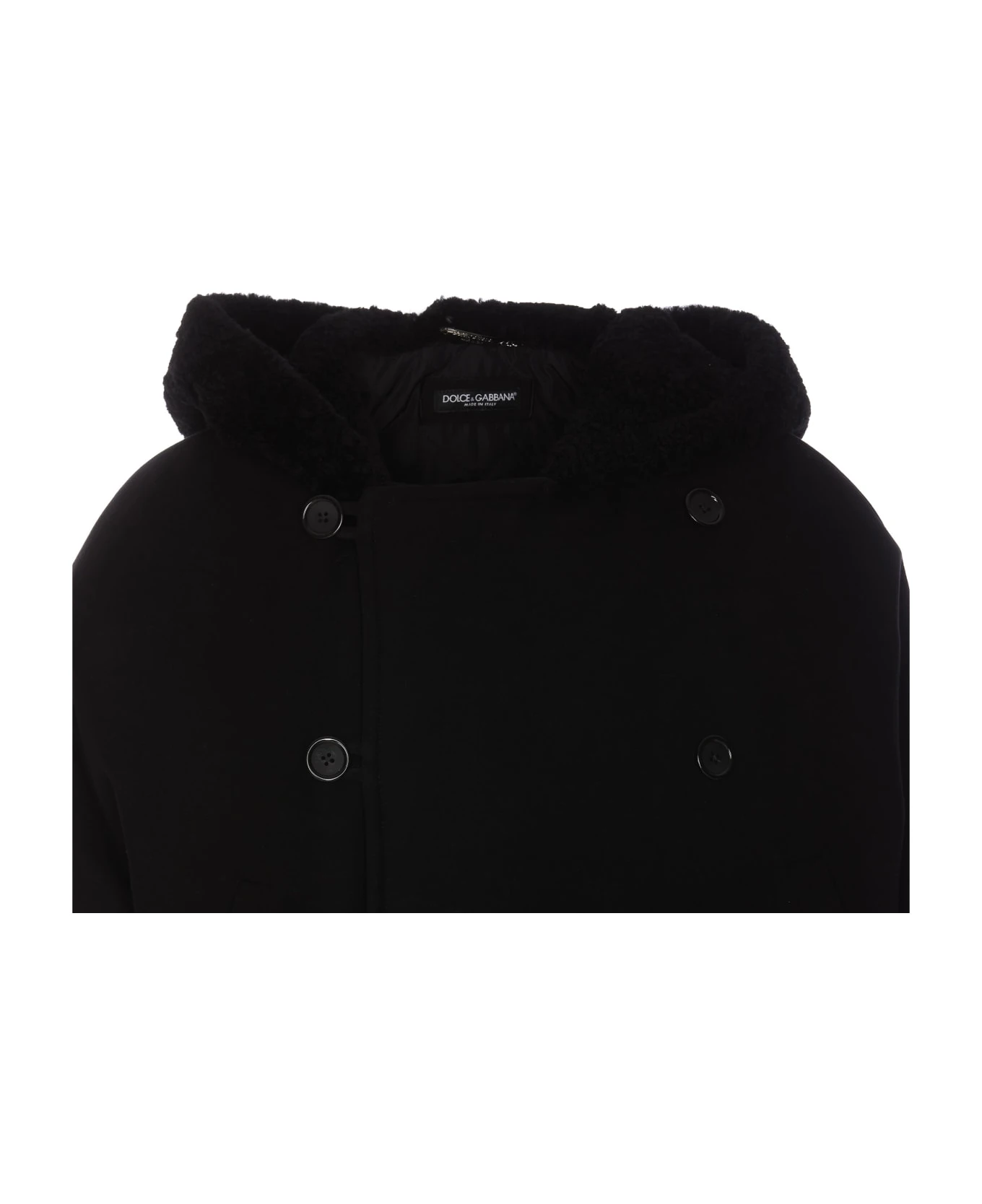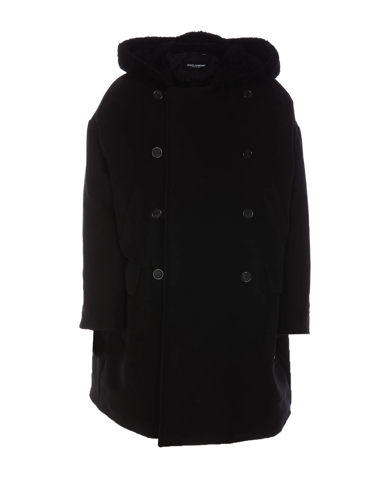 Dolce&Gabbana black coat with frontal double breasted buttons closure, hood detail, frontal maxi pockets and pockets, patch logo on sleeves, padded