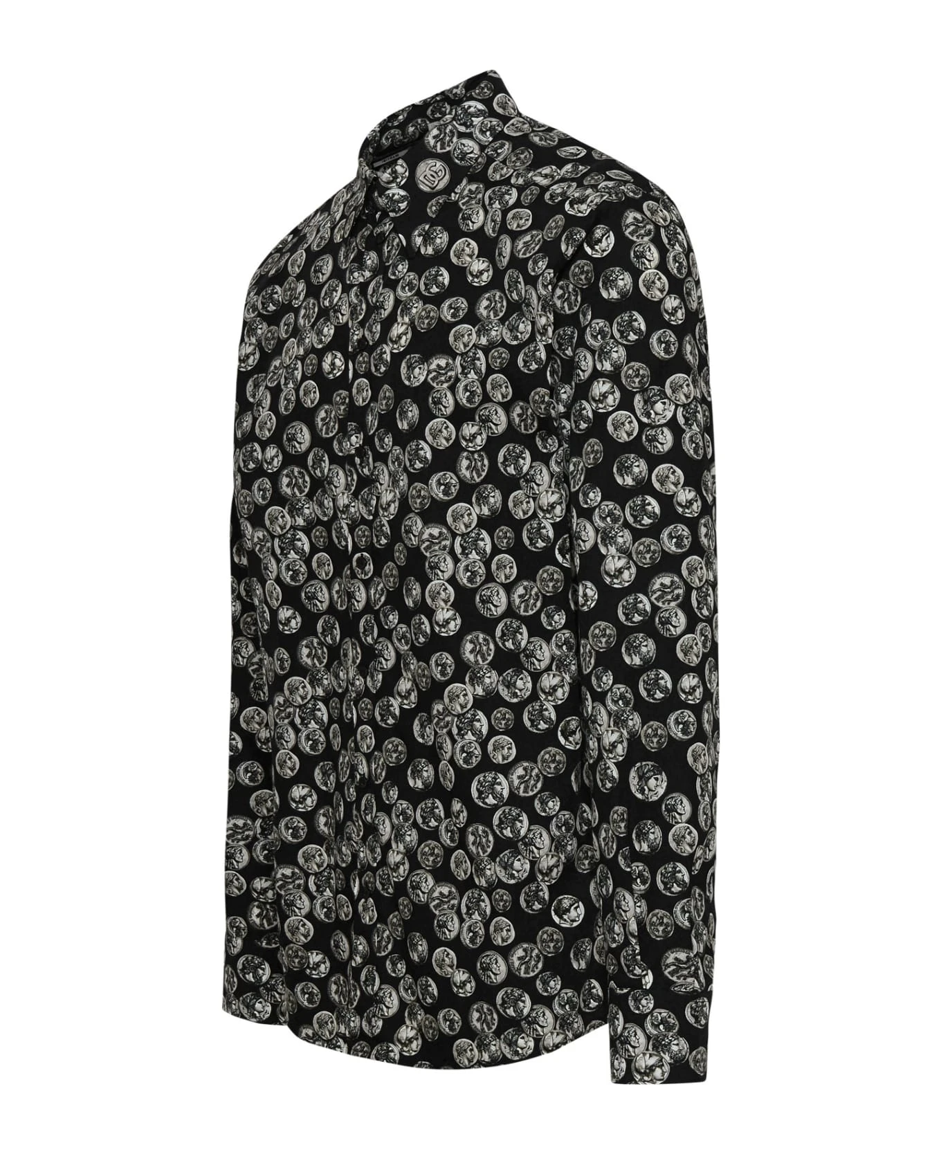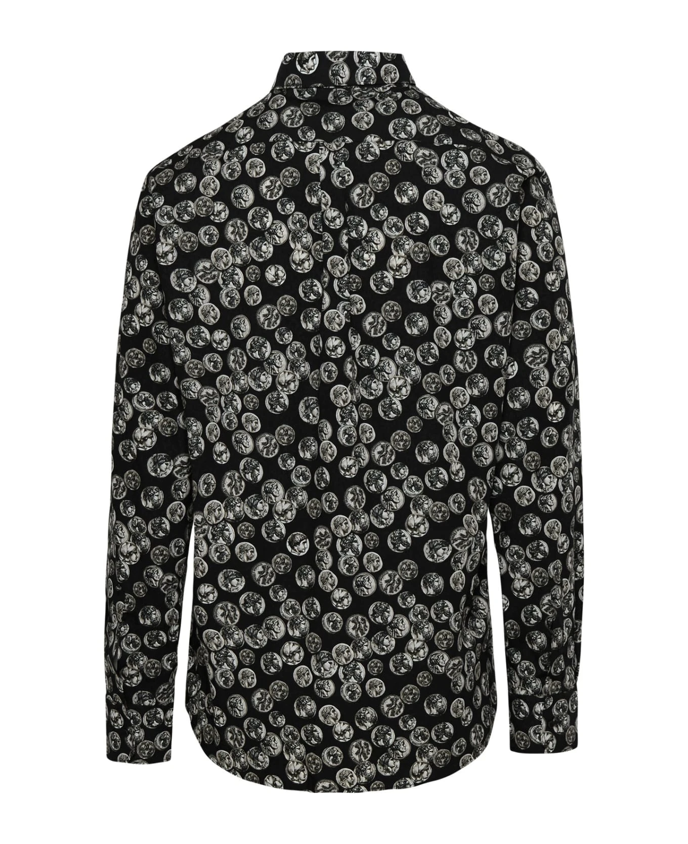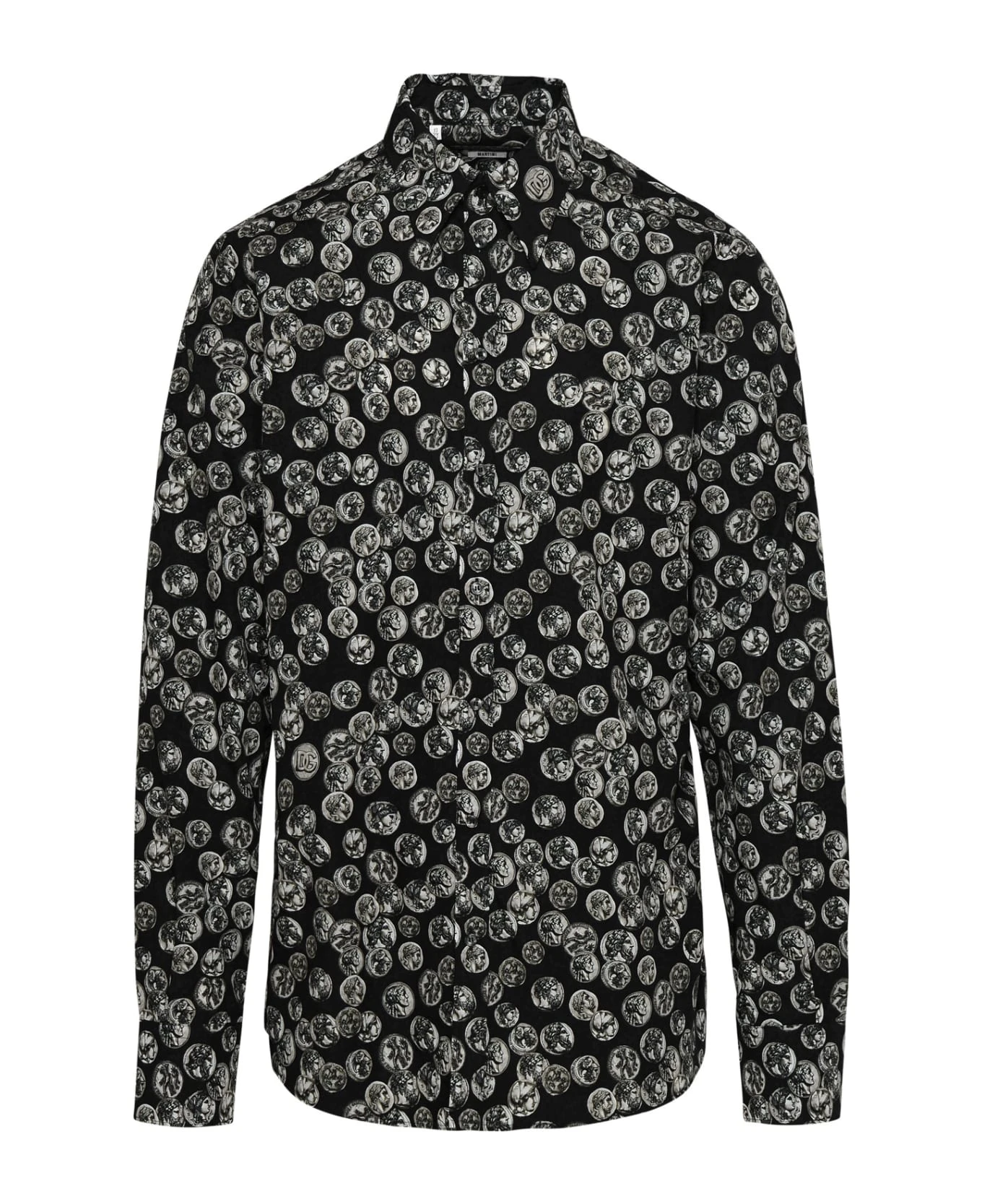 Pointed collar, all-over coin print, front button closure, and adjustable cuffs with buttons