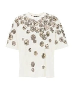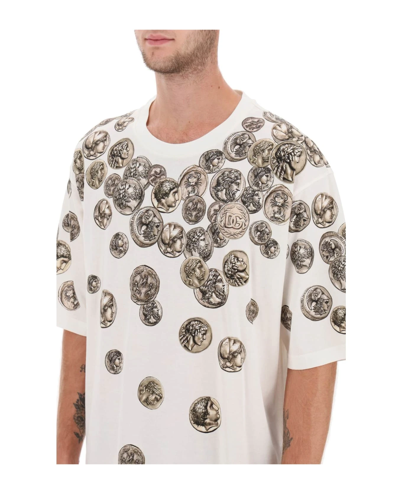 Dolce & Gabbana oversized t-shirt embellished with an all-over ‘Coins’ print. Made from lightweight cotton jersey, it is finished with a micro-ribbed crew neck. The model is 187 cm tall and wears a size L.