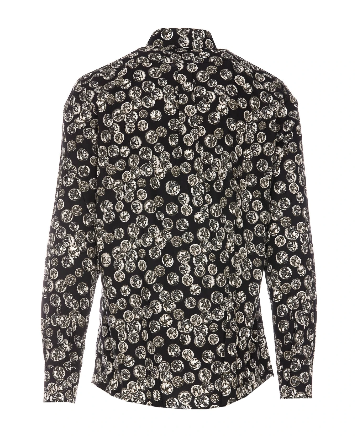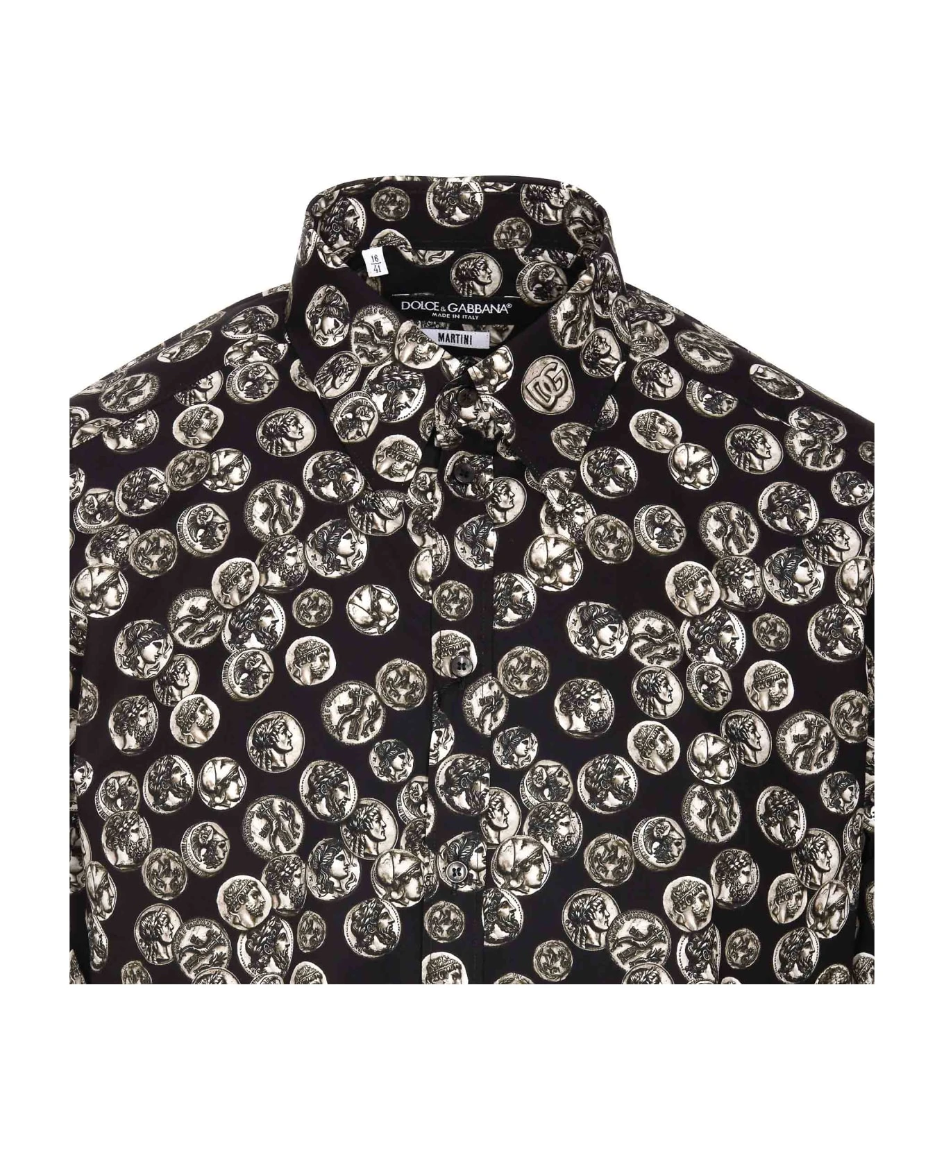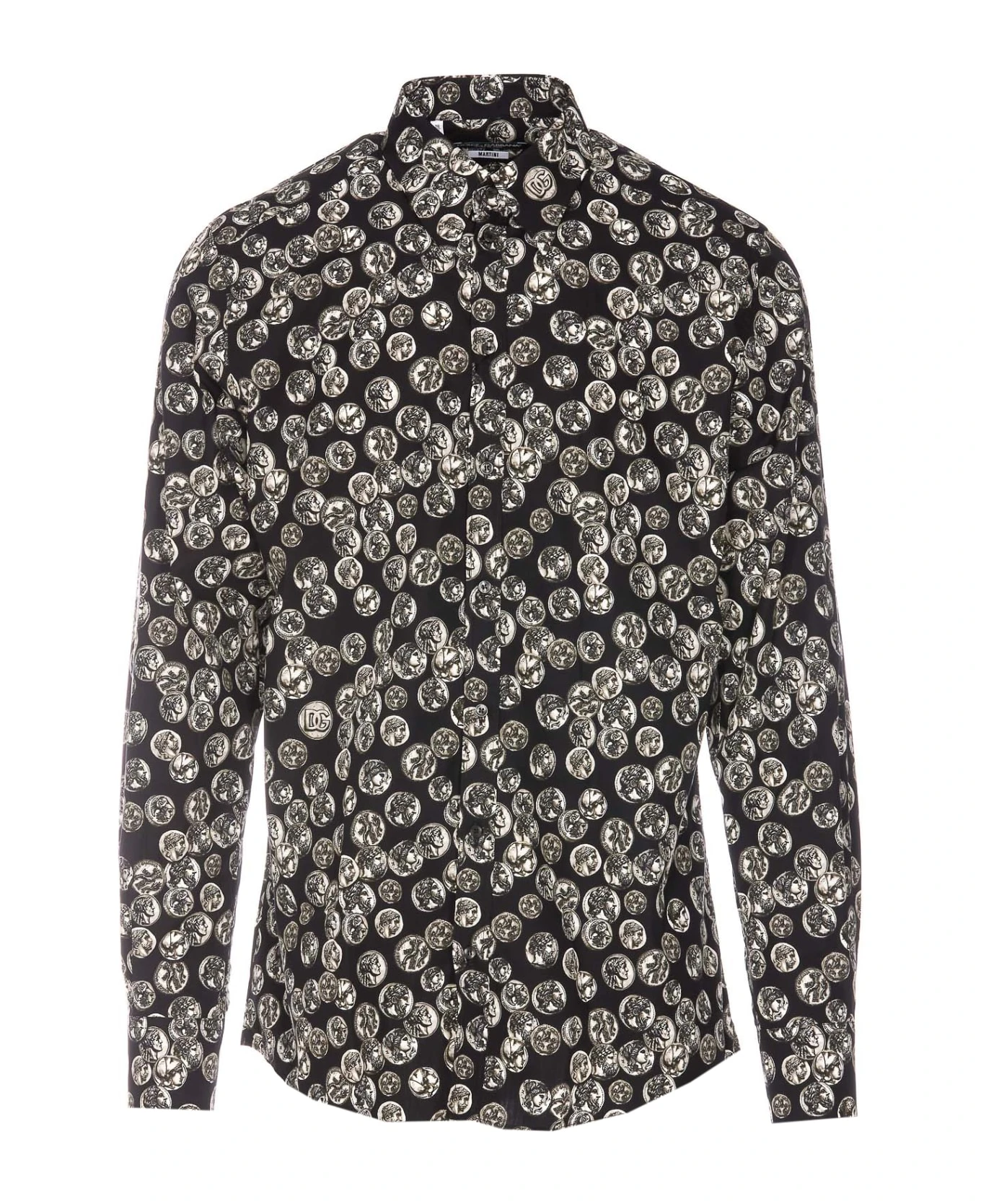 Dolce&Gabbana black shirt with frontal buttons closure, regular collar, all over Coint print, button on cuffs