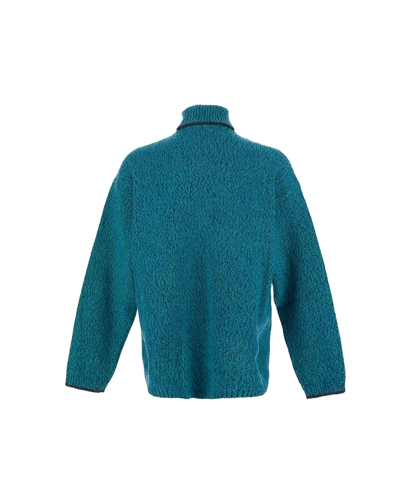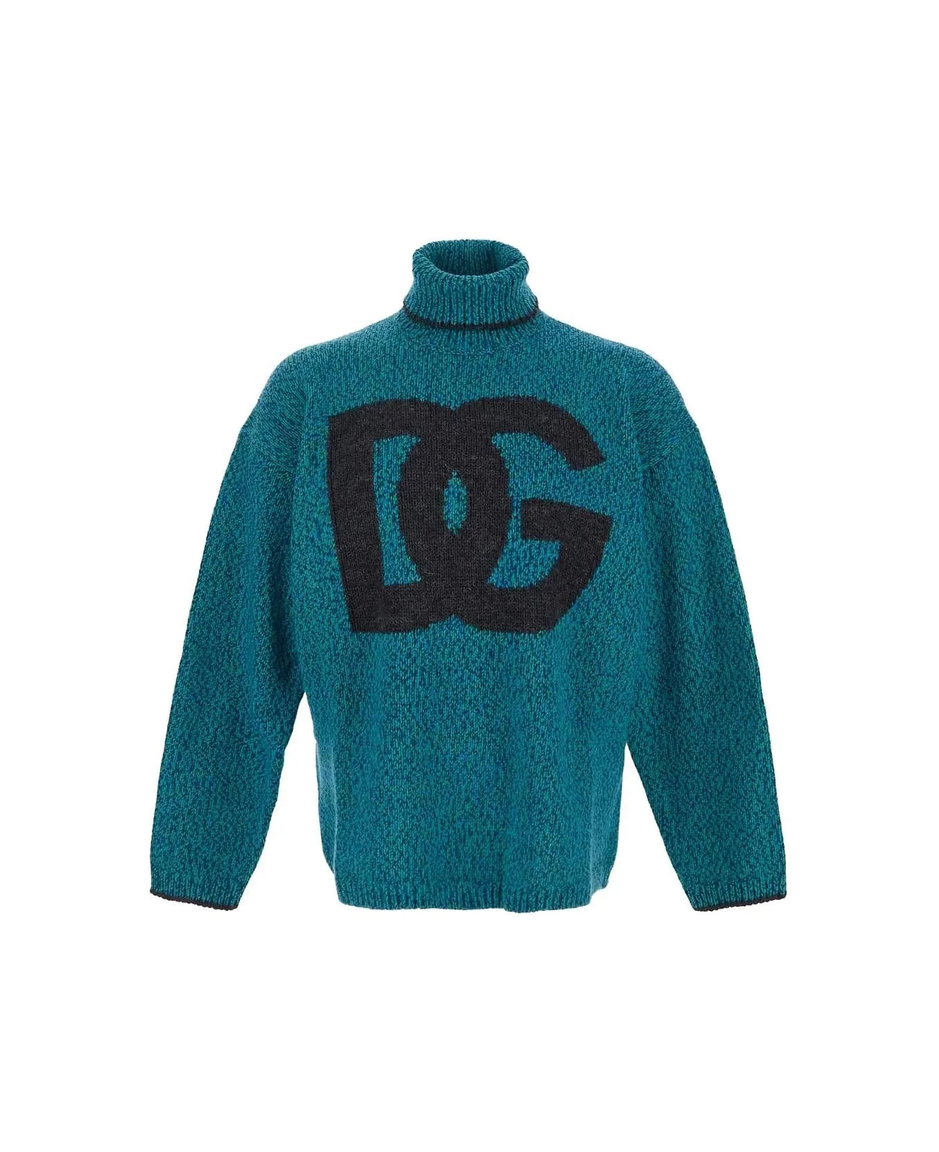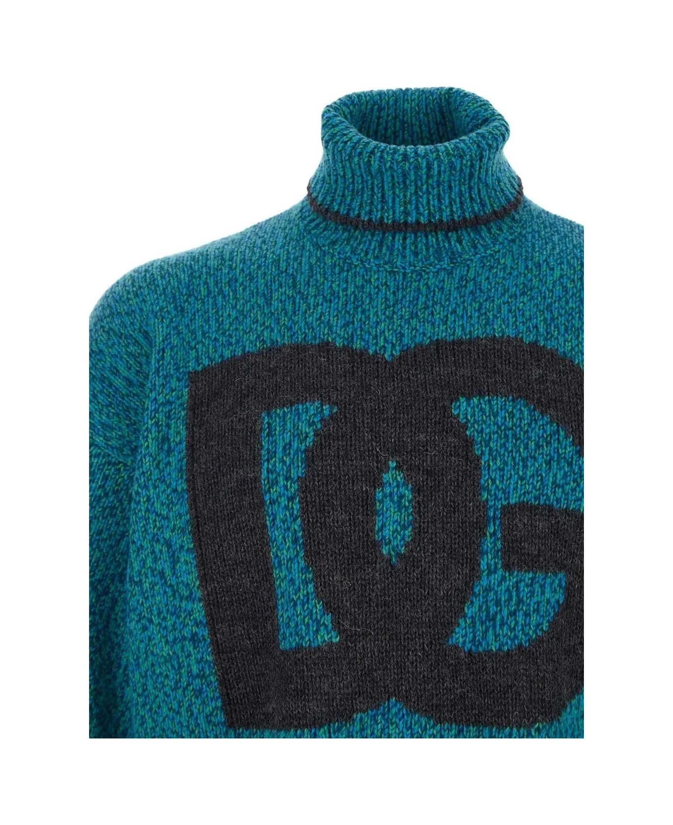 Dolce & Gabbana turtleneck knitwear in multicolor wool with dark grey inlaid DG logo on the front, long sleeves, neck with dark grey detail, elastic ribbed cuffs, waist and neck.