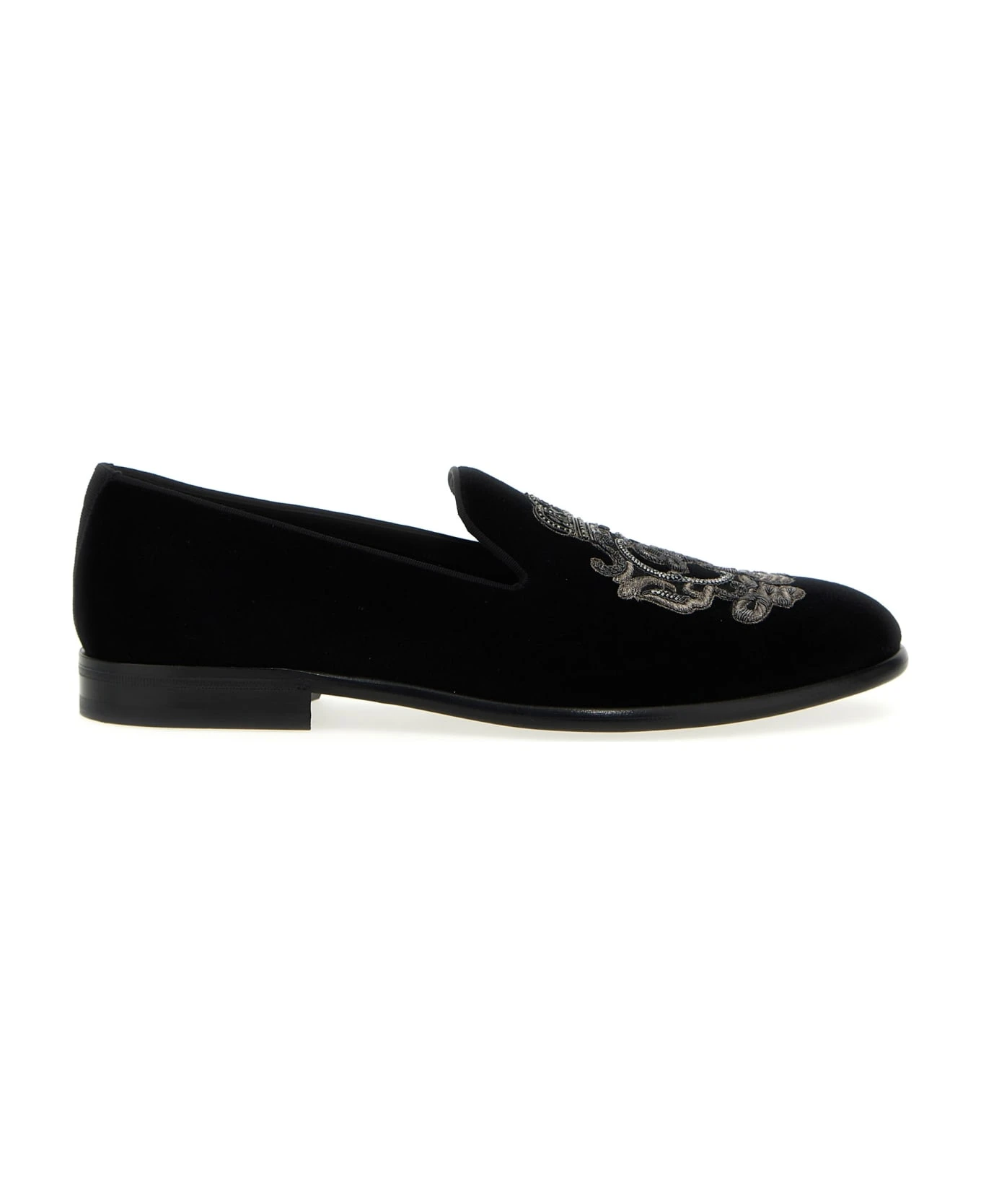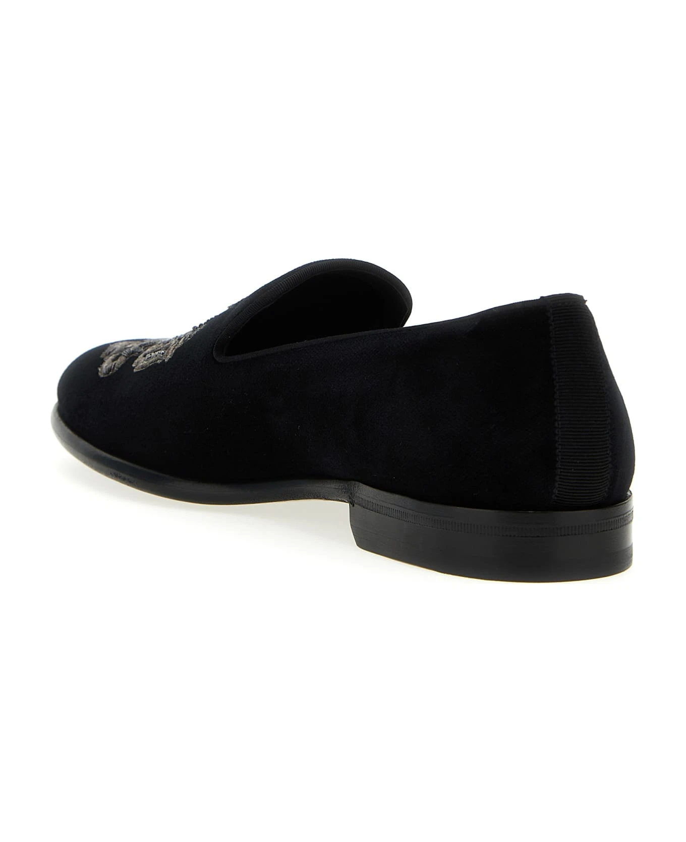 Velvet loafers with embroidered emblem and leather sole.
