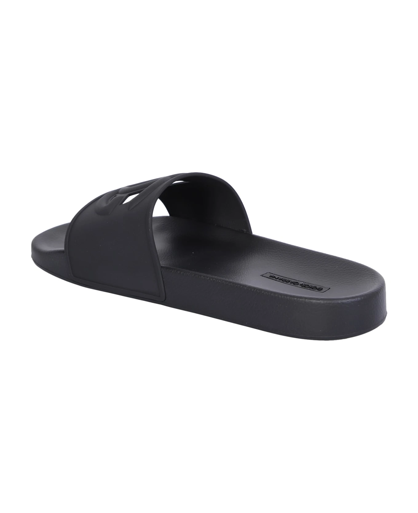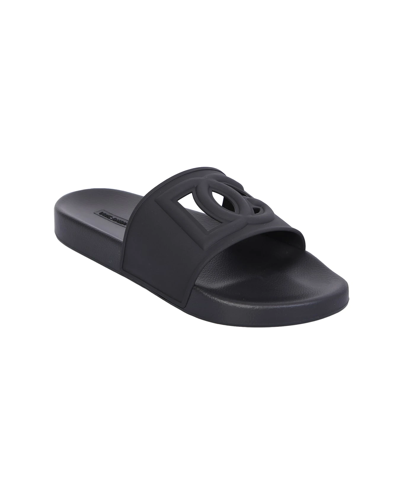 Open toe. Embossed logo to the front. Slip-on style. Cut-out detail. Color: black