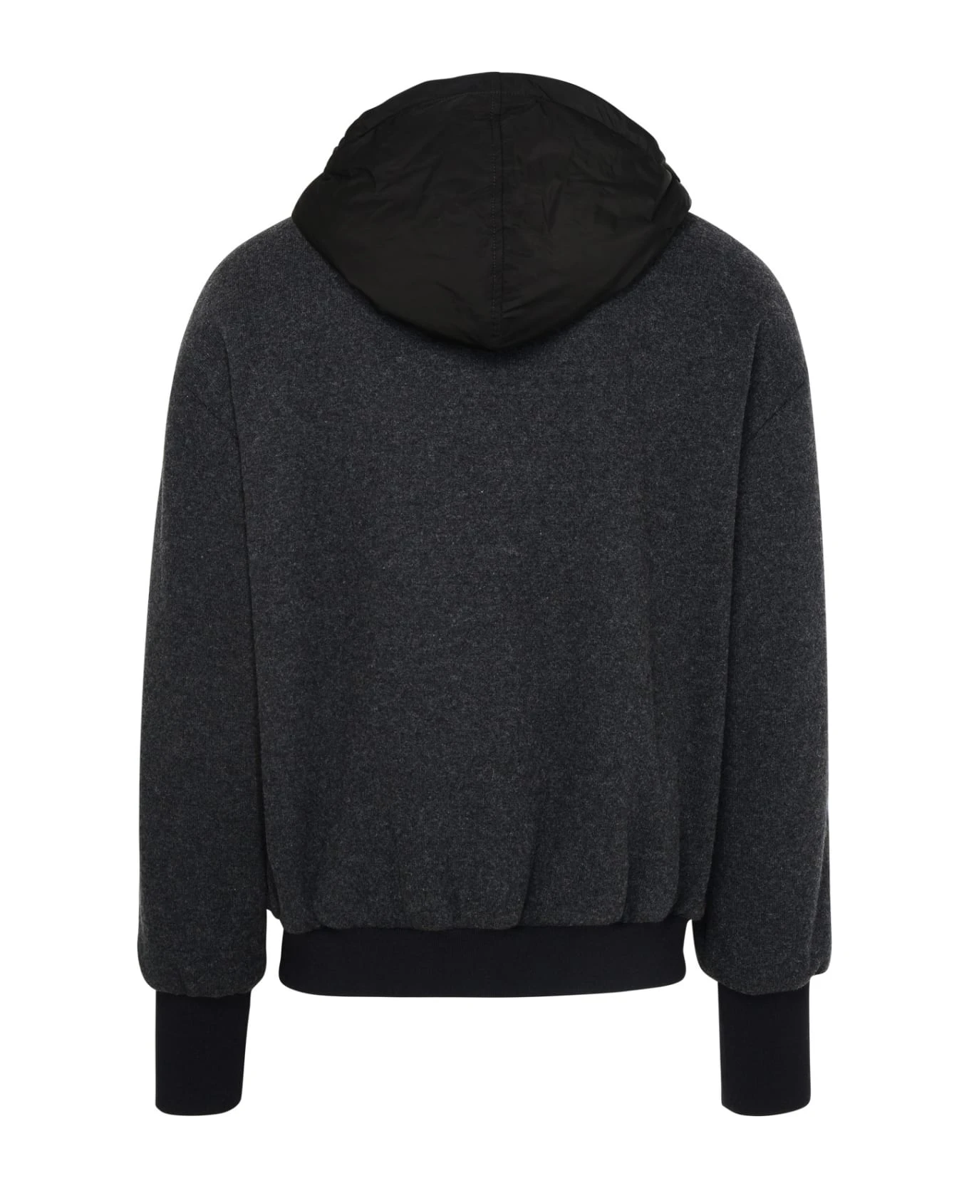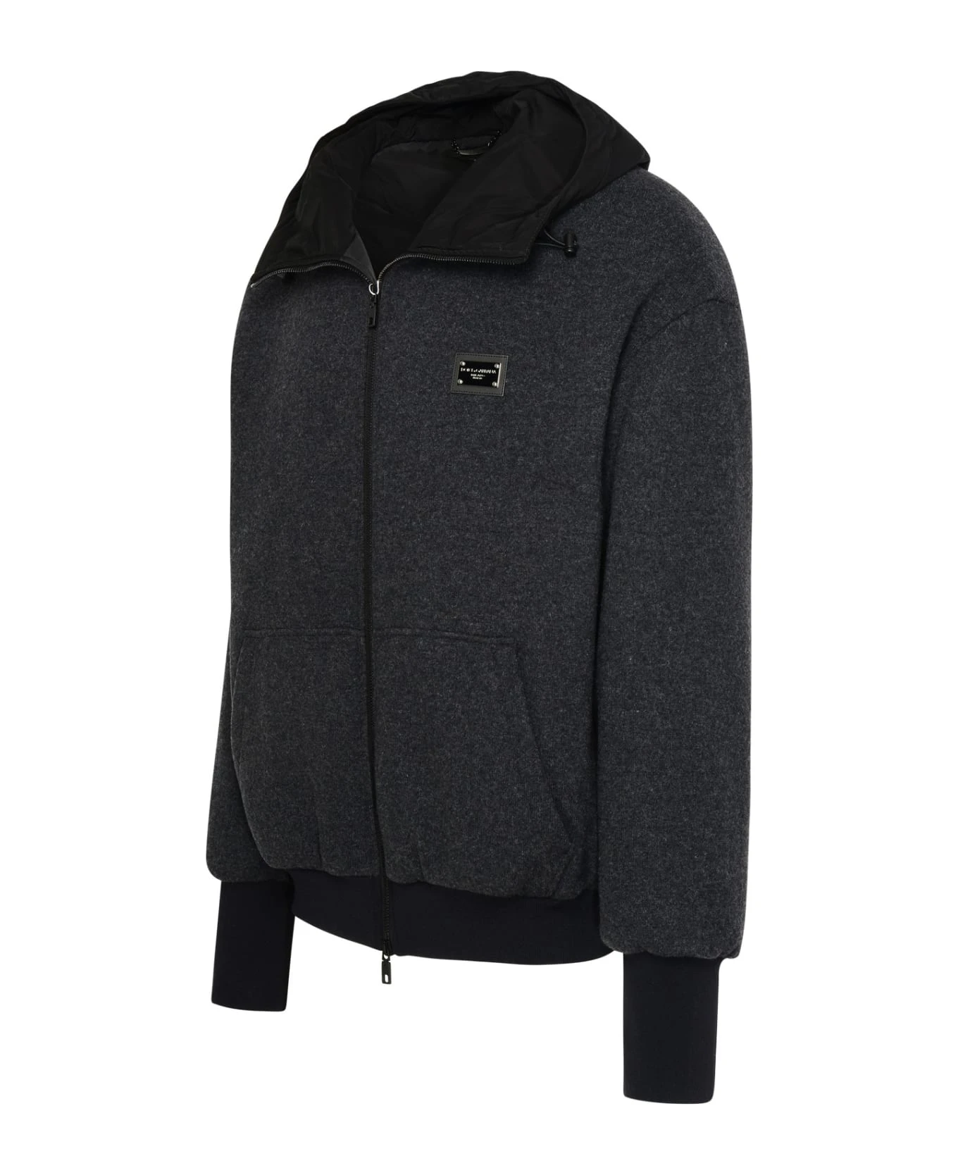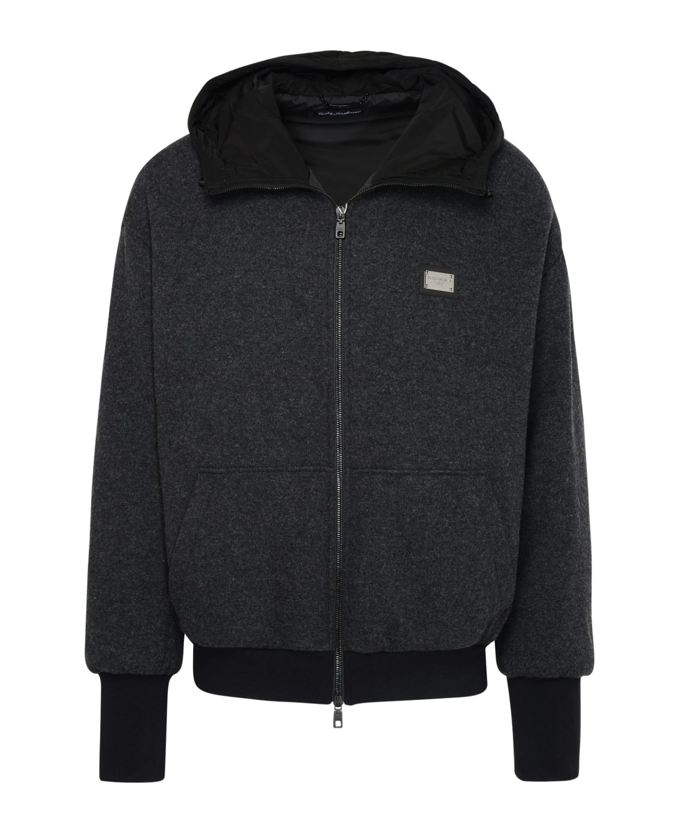 Padded nylon hood with drawstring, metal plaque with engraved logo on the chest, front pockets, ribbed cuffs and hem, front zip closure
