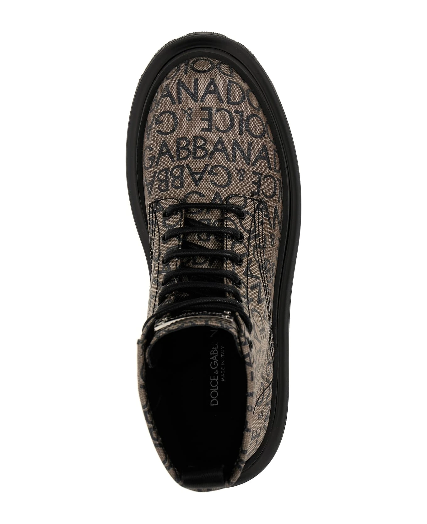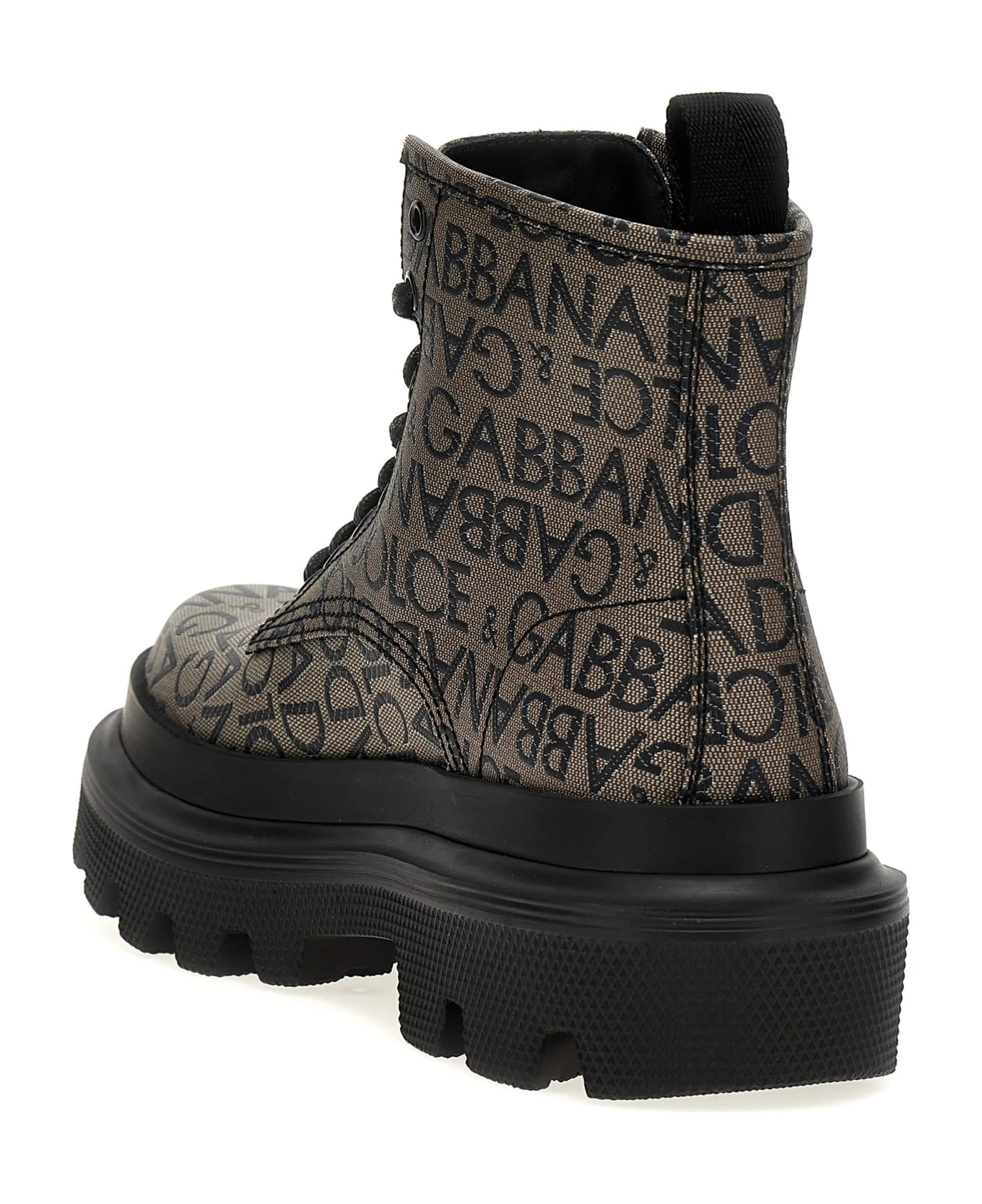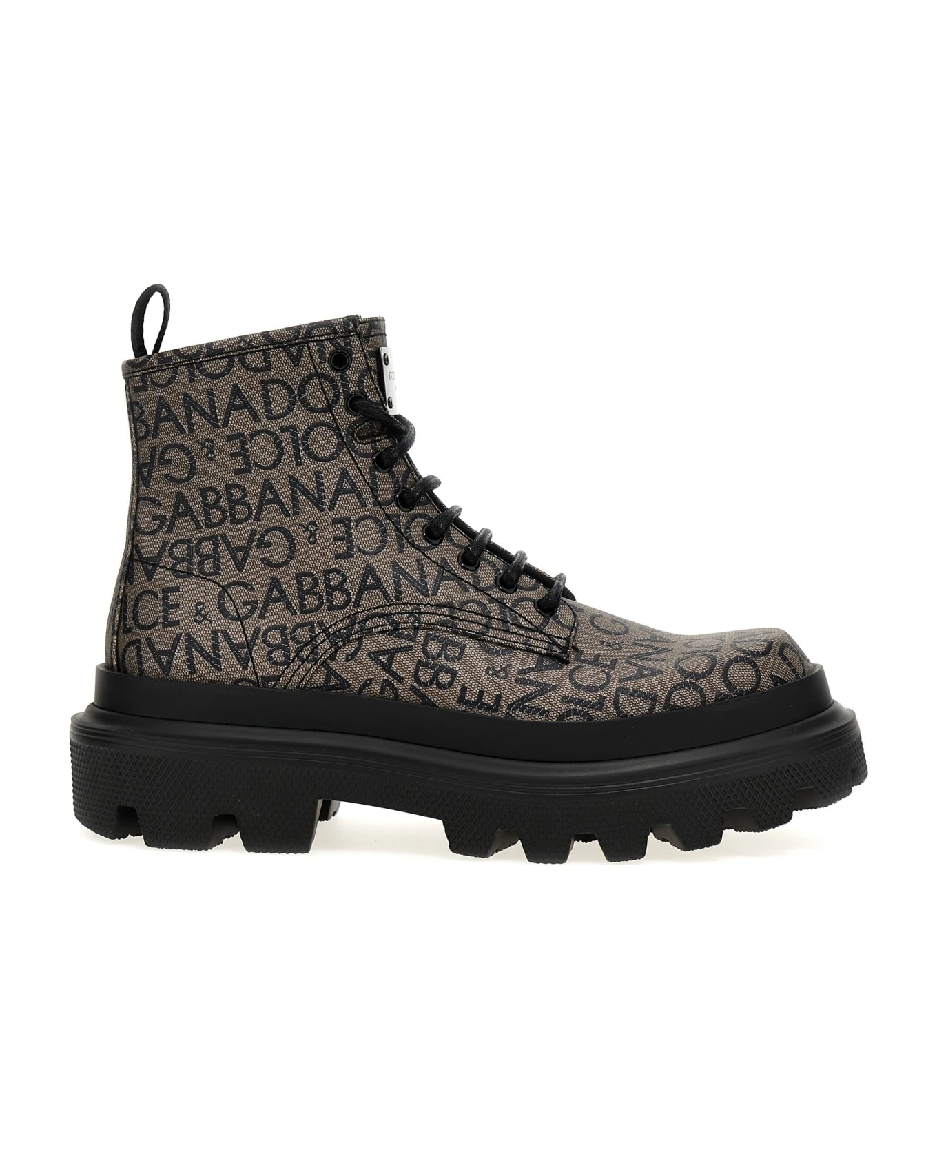 Fabric combat boots with all-over jacquard logo pattern, laces, logo plaque, rubber sole.