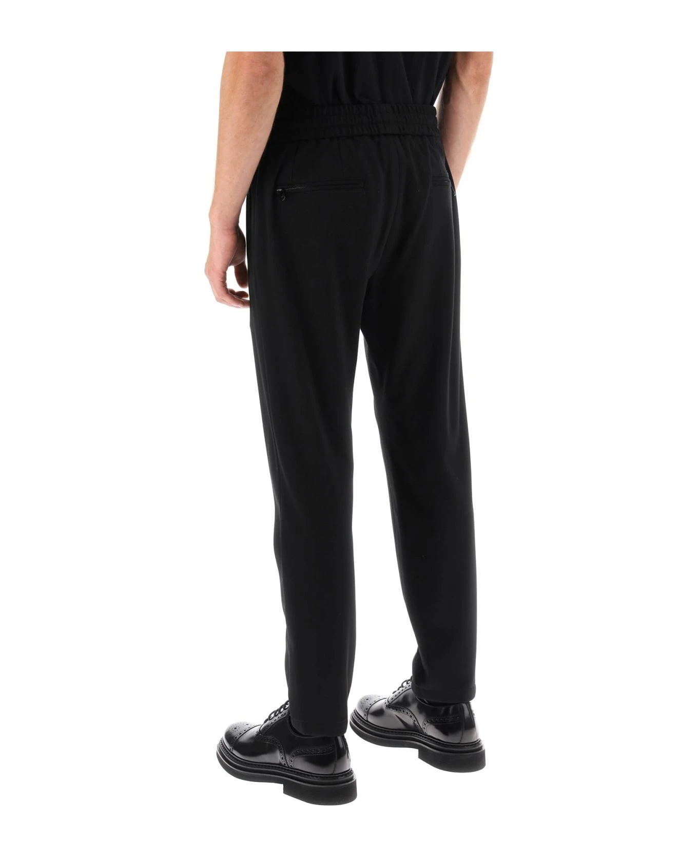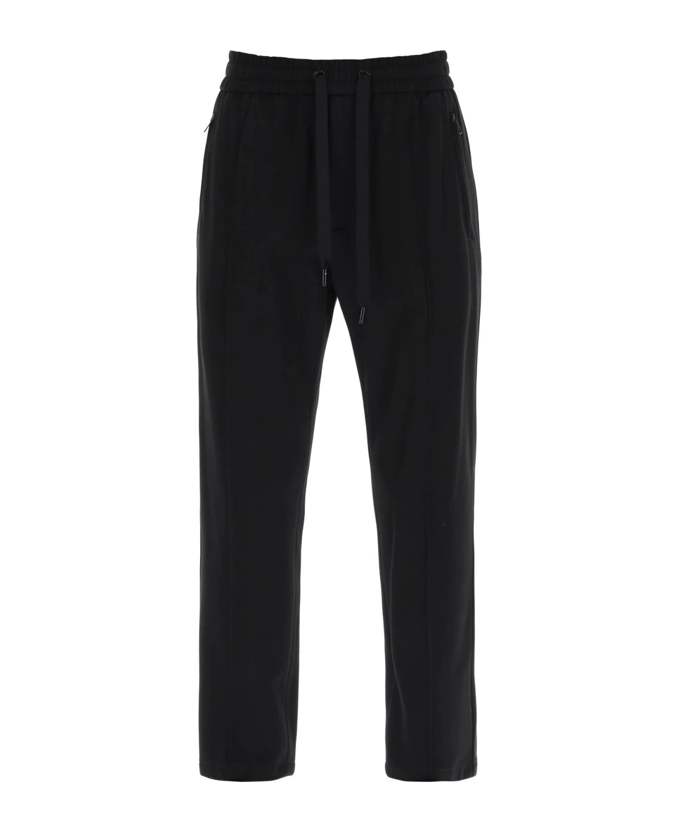 Dolce&Gabbana joggers crafted in viscose blend herringbone jersey. They feature elasticated waistband with drawstring and welt pockets with zipper on sides and back. Slim fit with tapered leg enhanced by pintucks. The model is 187 cm tall and wears size IT 48.