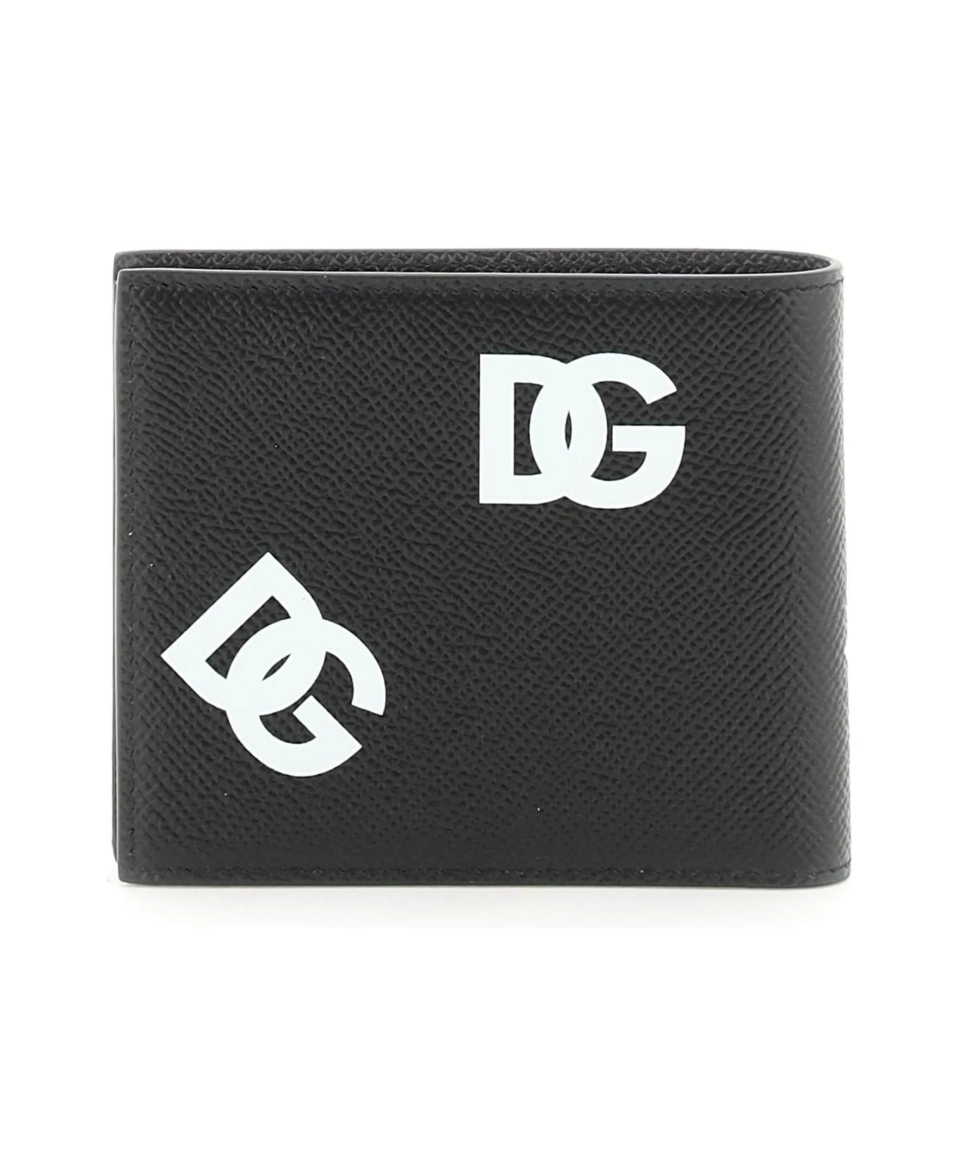 Grained leather wallet by Dolce & Gabbana with all over contrasting logo and iconic metal plaque applied to the front. Interior with bill compartment, six credit card slots and two slit pockets.