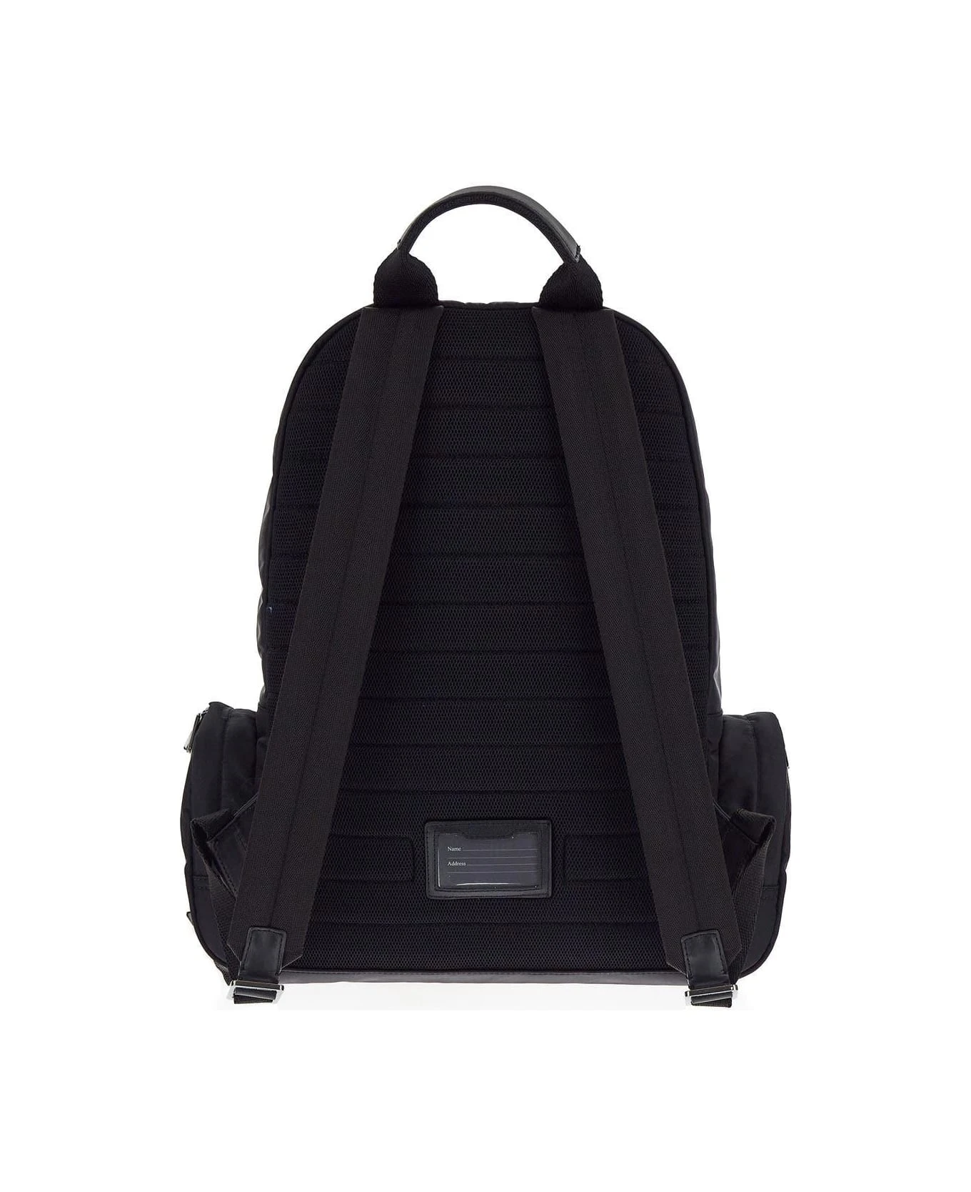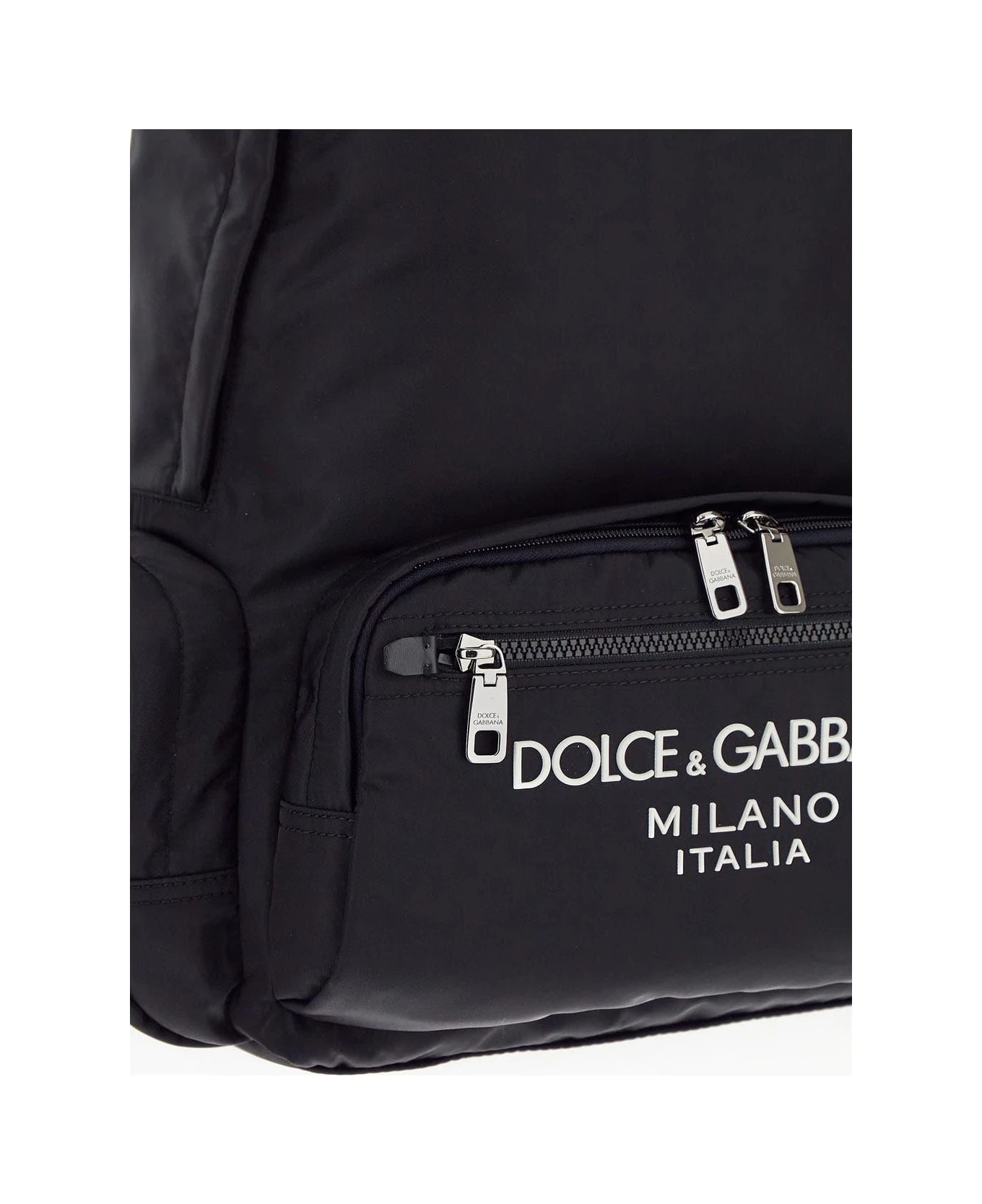 Dolce & Gabbana backpack in black nylon featuring top fastening with double zipper, logoed sliders, internal space with laptop compartment, smartphone pocket and zipped pocket, two external side pockets with black zip and double branded sliders, two frontal zipped pockets with white rubberized logo at front, top handle and adjustable tape shoulder straps with calfskin details.