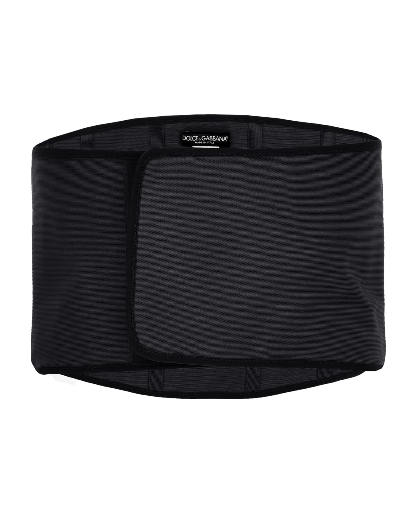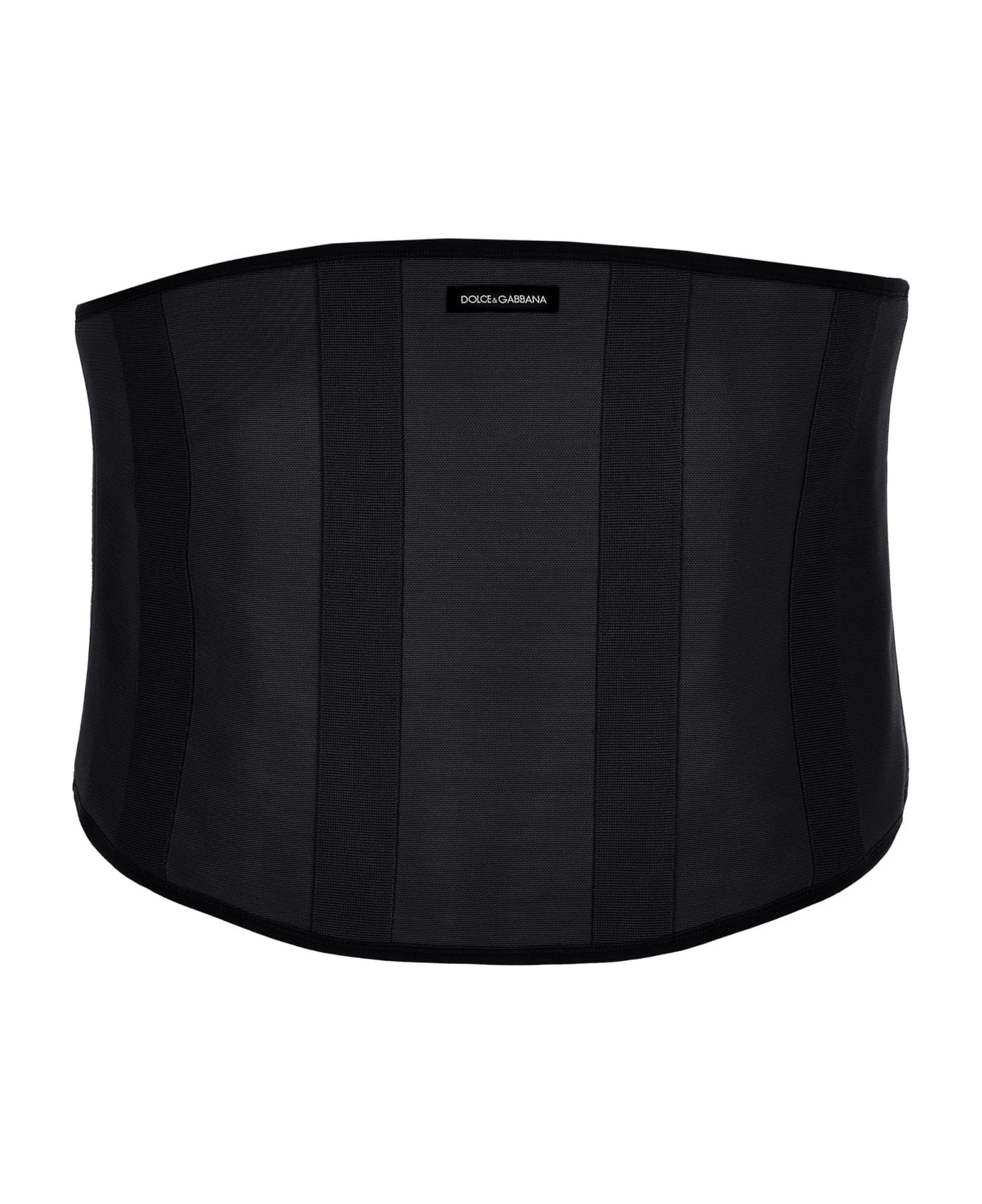 Bustier in elastic fabric with slats, logo label, adjustable hook and loop closure.