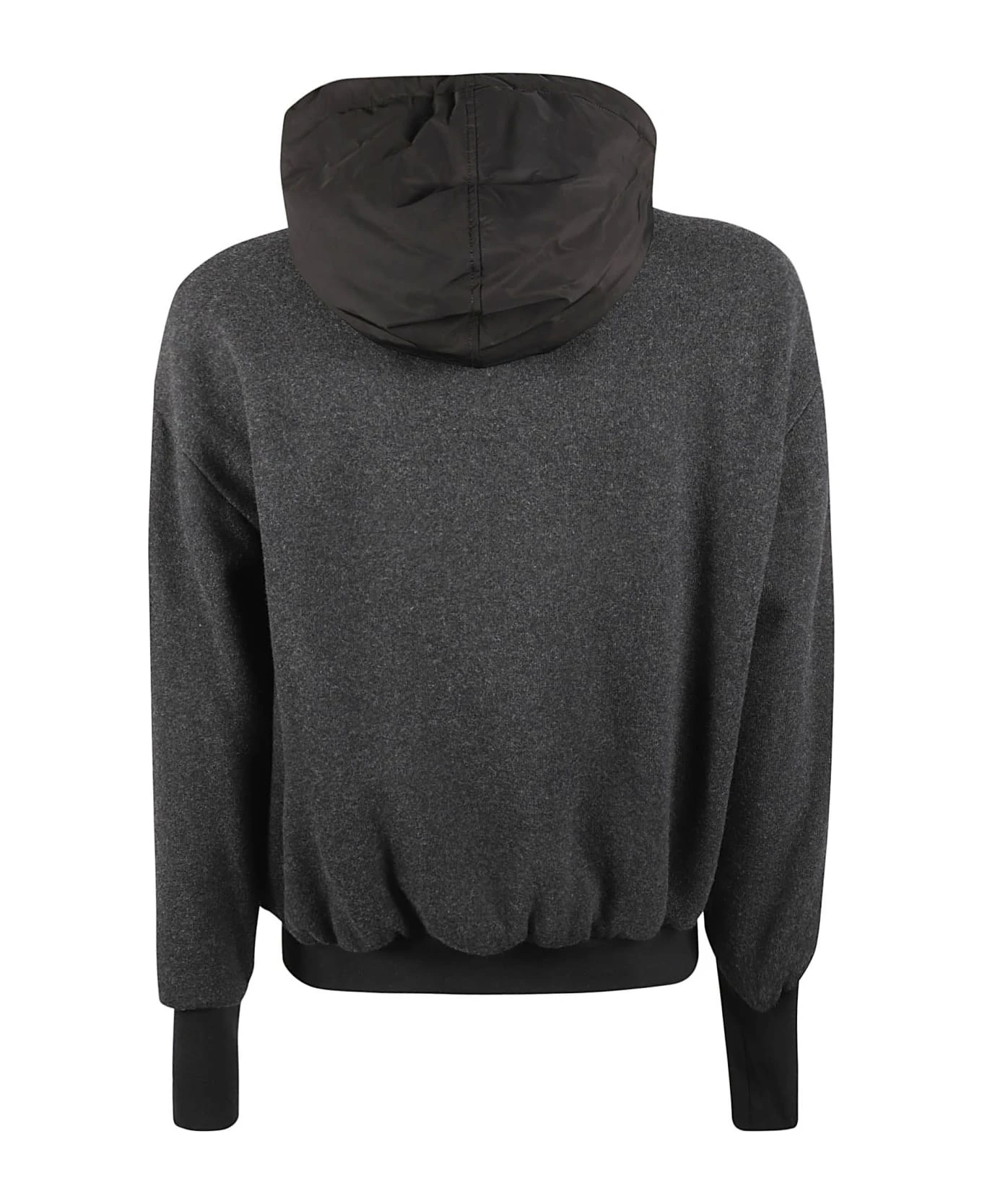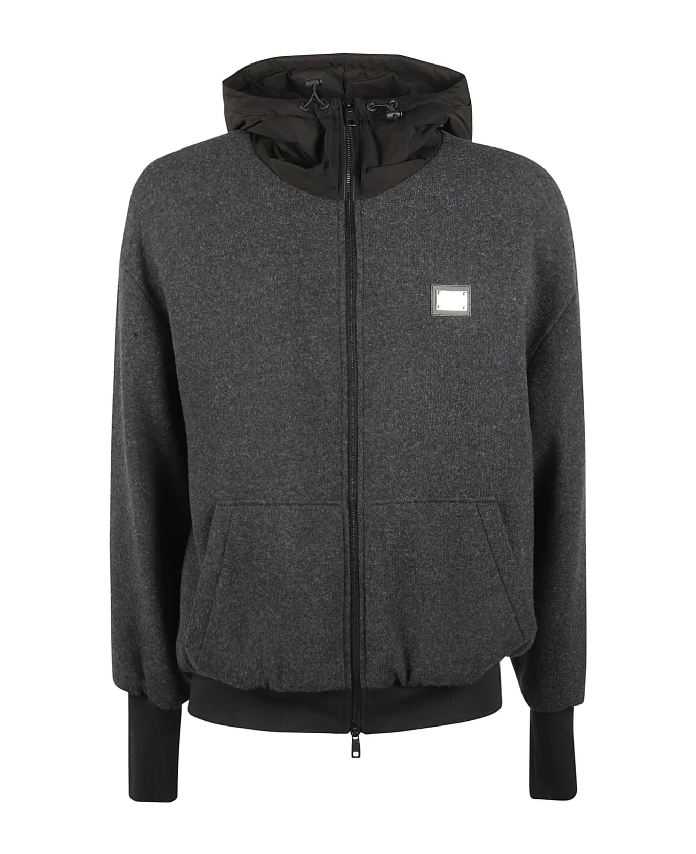 hooded zip-up jacket from DOLCE & GABBANA featuring black, wool-cashmere blend, high neck, drawstring hood, logo plaque, front zip fastening, long sleeves and two front pouch pockets.