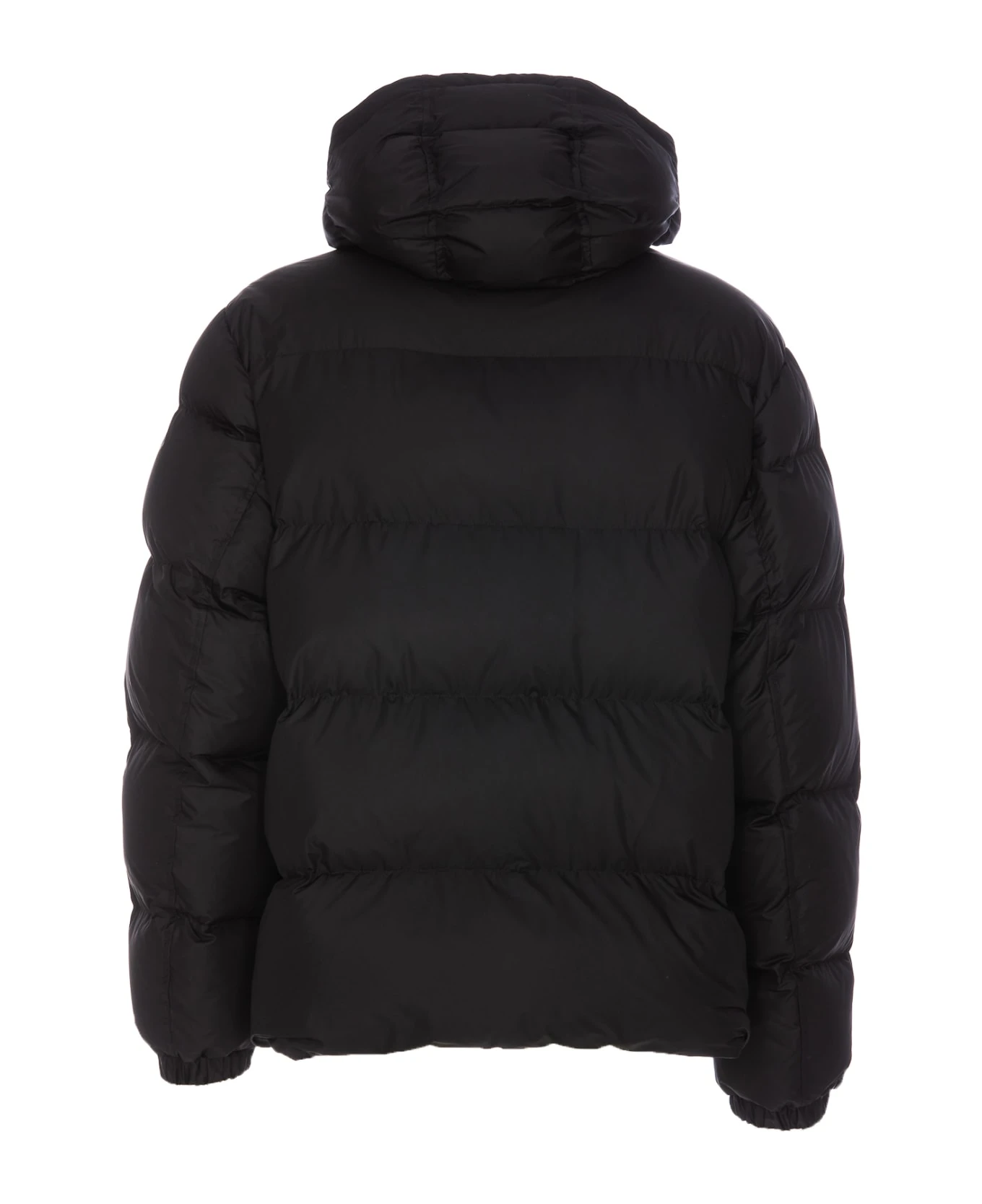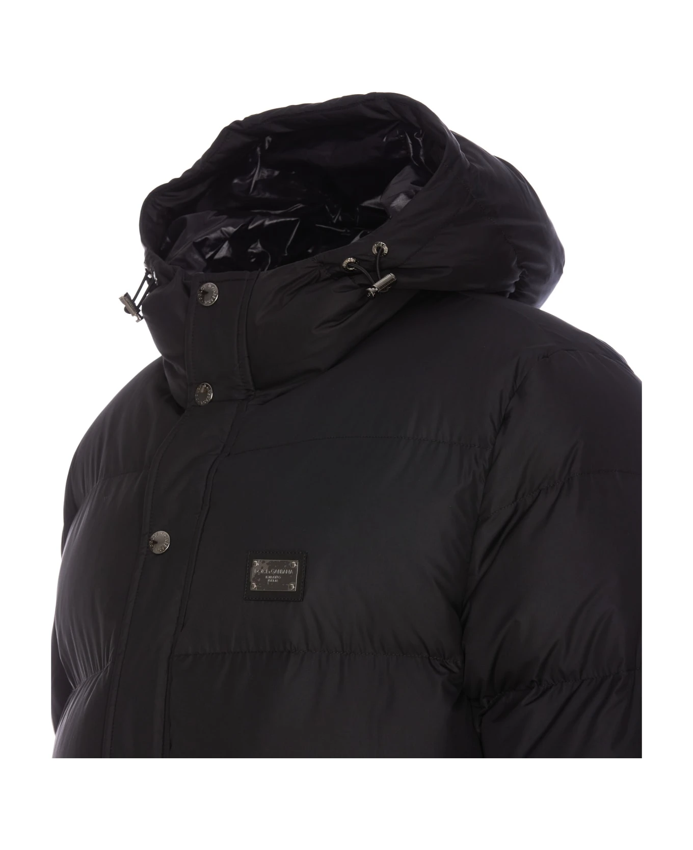 Dolce&Gabbana black down jacket with frontal zip closure, hood, padded, plaque logo on the front, pocket with button closure