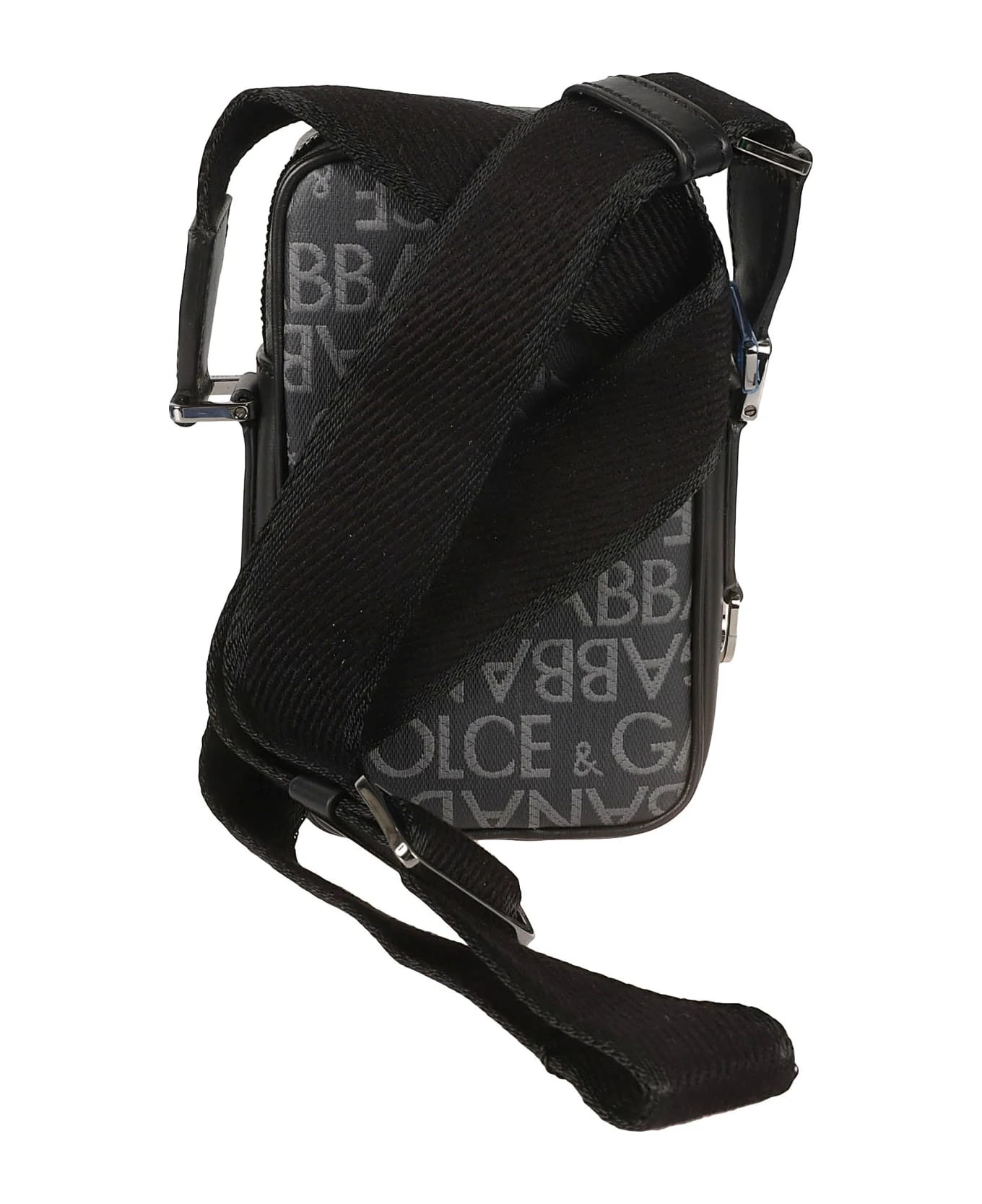 logo-print messenger bag from DOLCE & GABBANA featuring black, grey, silver-tone hardware, all-over logo print, logo plaque, top zip fastening, adjustable shoulder strap and main compartment.