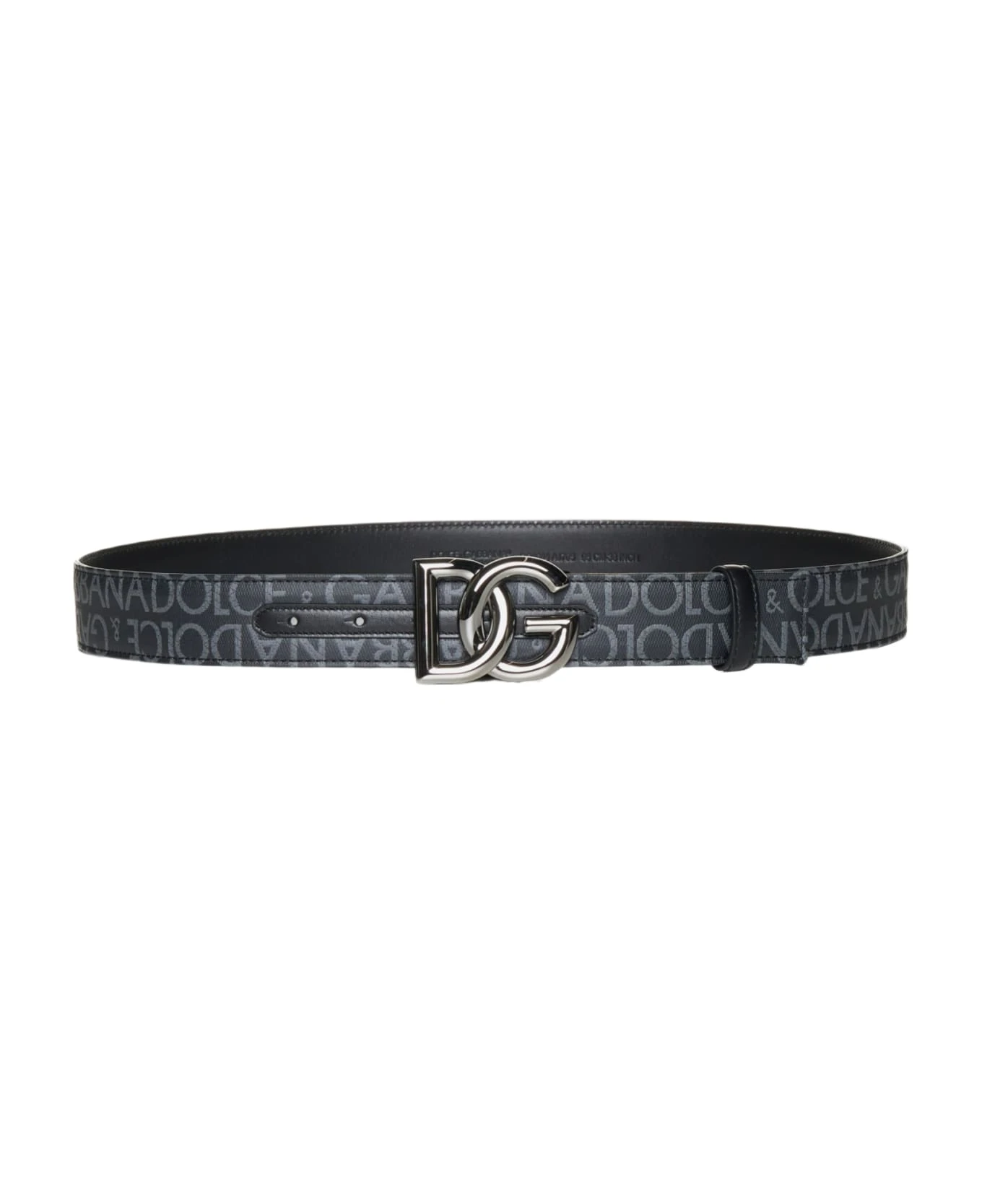 Dolce & Gabbana’s fabric belt featuring grey logo-tape motif on a black background, silver-tone DG logo plaque, black leather lining and loops.