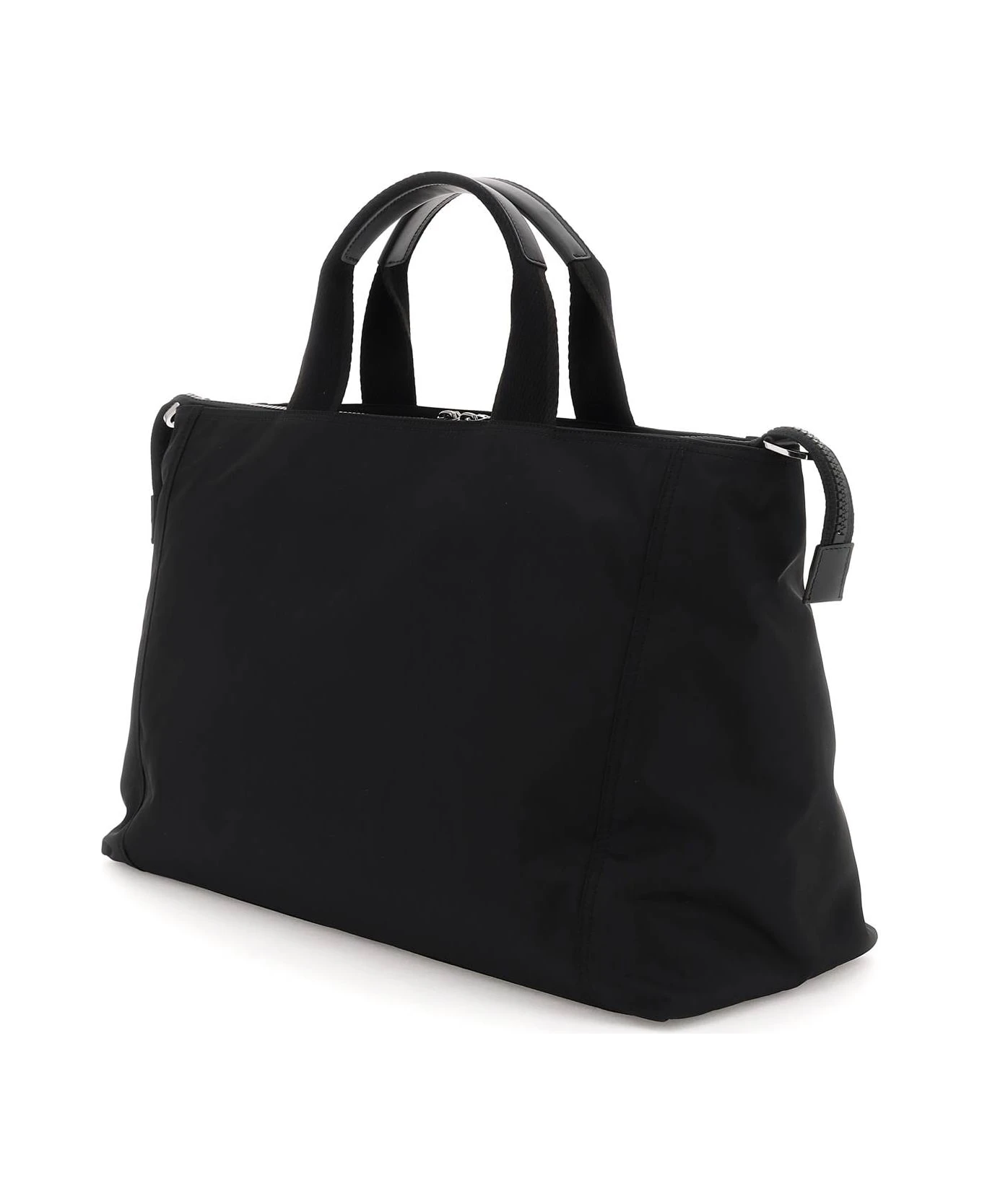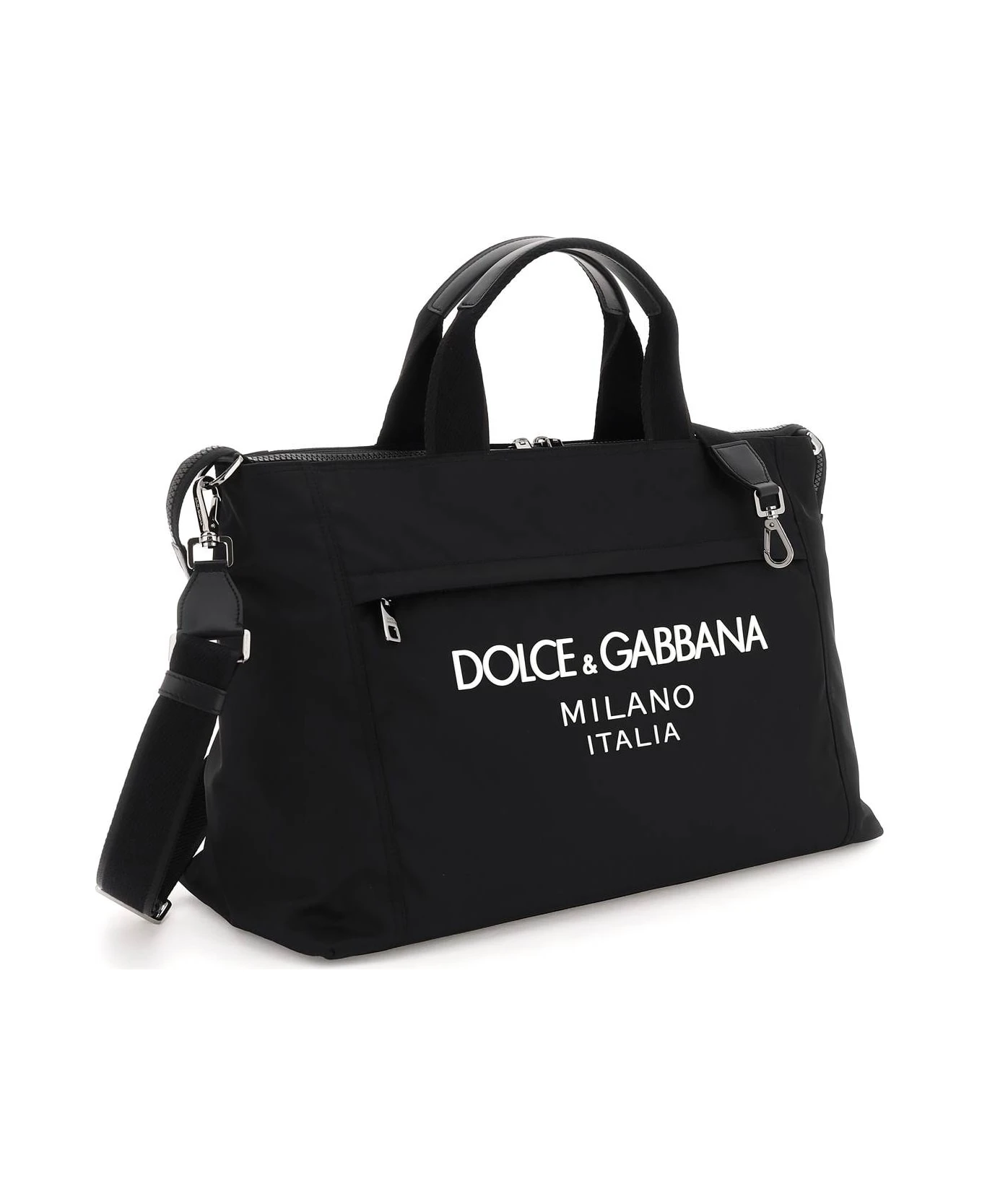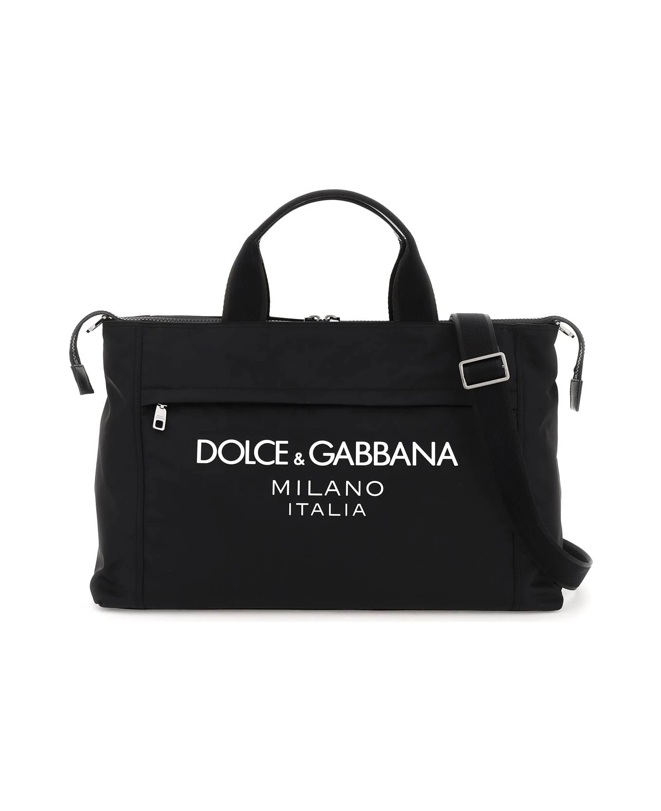 Duffel bag made of nylon by Dolce & Gabbana with rubber and contrasting lettering logo on front. Double handle with leather inset, zippered closure, lined interior with two open pockets, front zippered pocket, and adjustable, detachable shoulder strap. Silver-finished metalware.