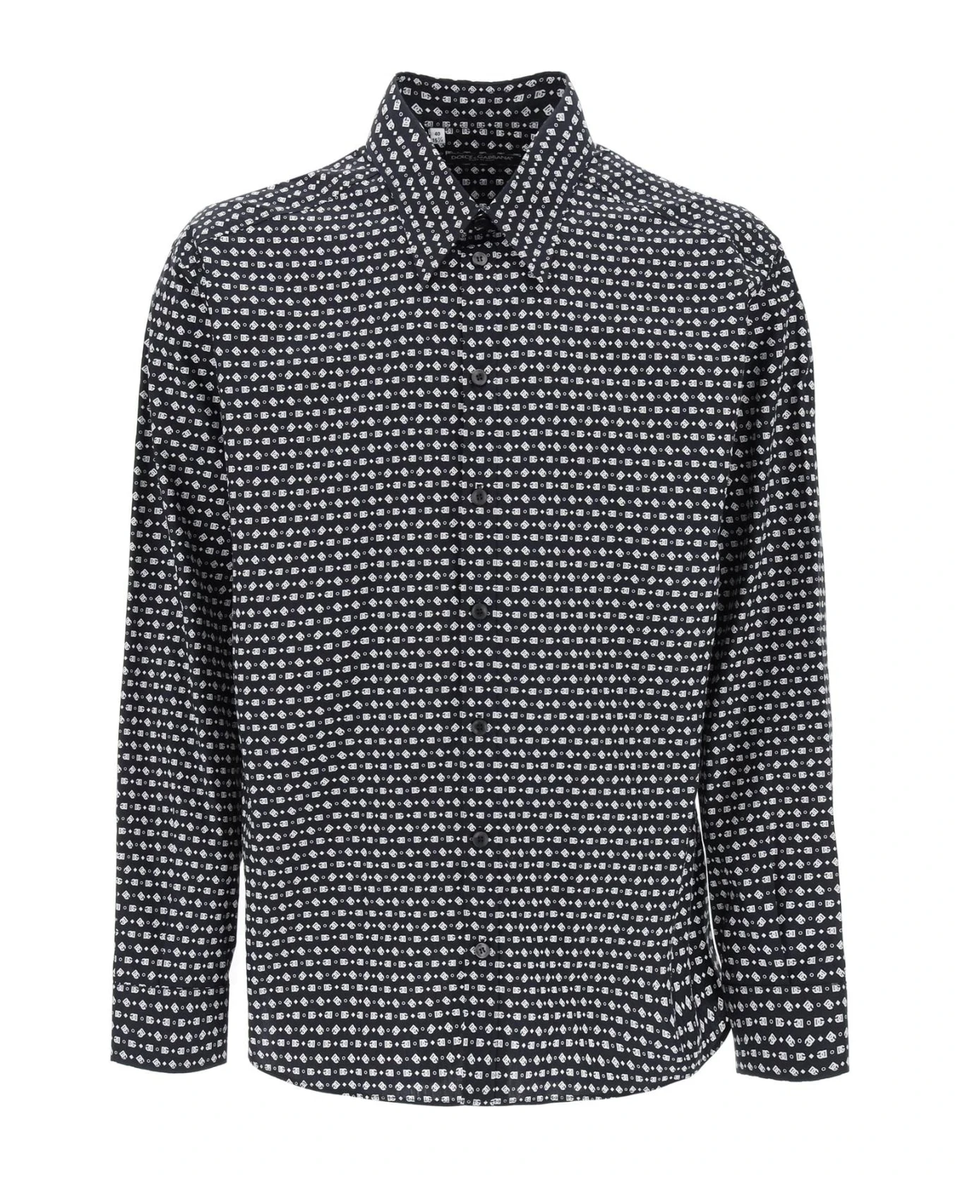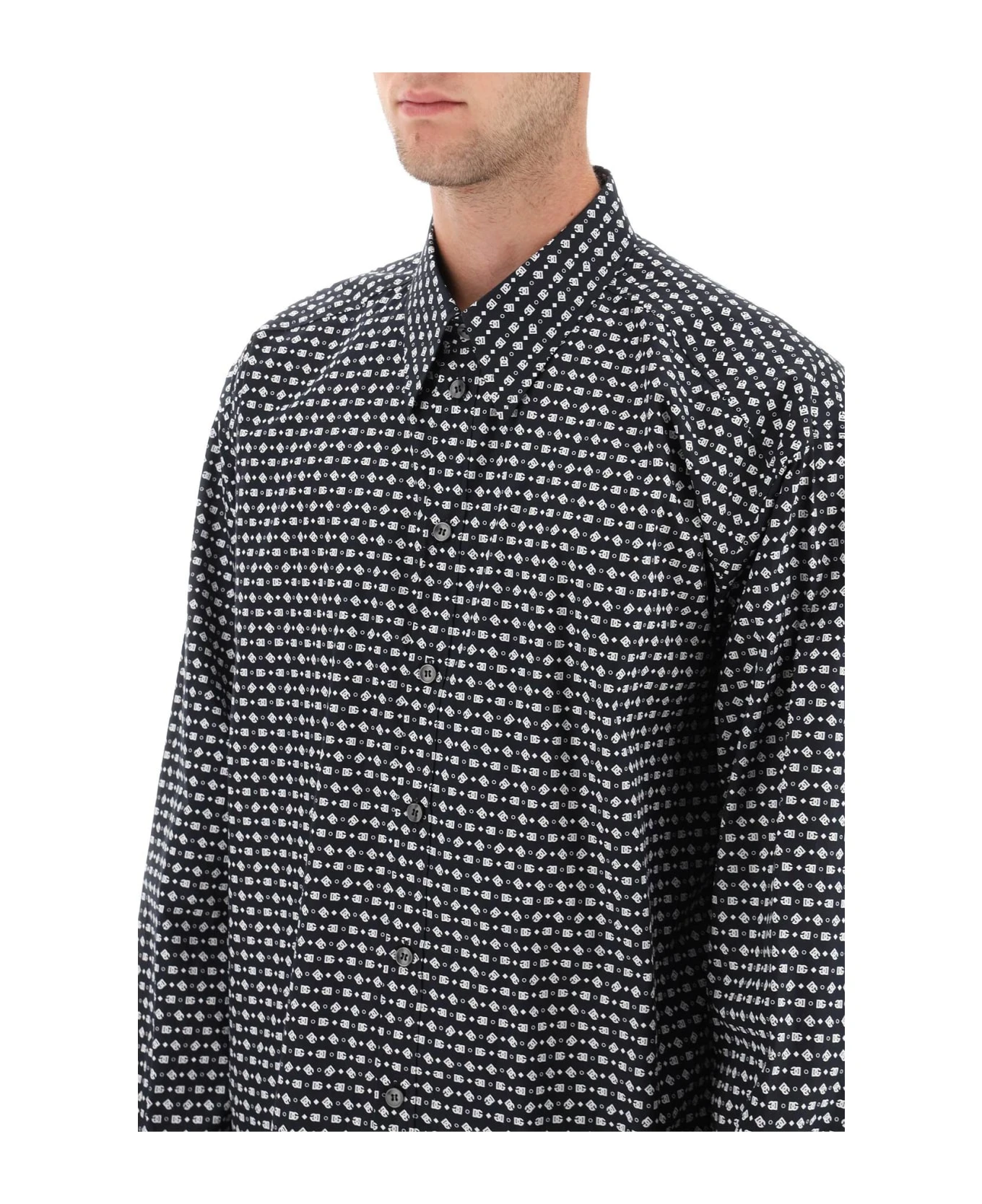 Dolce & Gabbana button-up shirt crafted of cotton poplin with an all-over micro monogram pattern. Designed for an oversized fit, it is finished with a classic Italian collar and mitered cuffs. The model is 187 cm tall and wears a size 40.