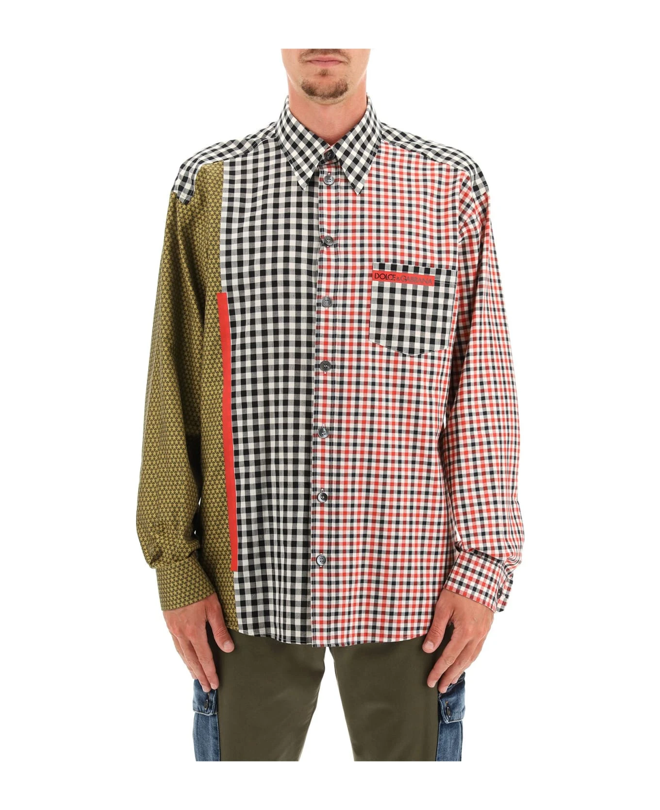 Dolce & Gabbana shirt in cotton and linen with a loose straight cut, enhanced by a color-block gingham pattern and by a stars motif on the side insert and right sleeve. Patch chest pocket finished with framis detail and logo lettering. Classic pointed collar, front closure with mother-of-pearl buttons and French cuffs. Curved hem. The model is 185 cm tall and wears a size 39.
