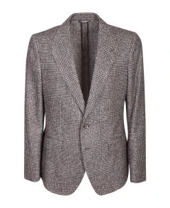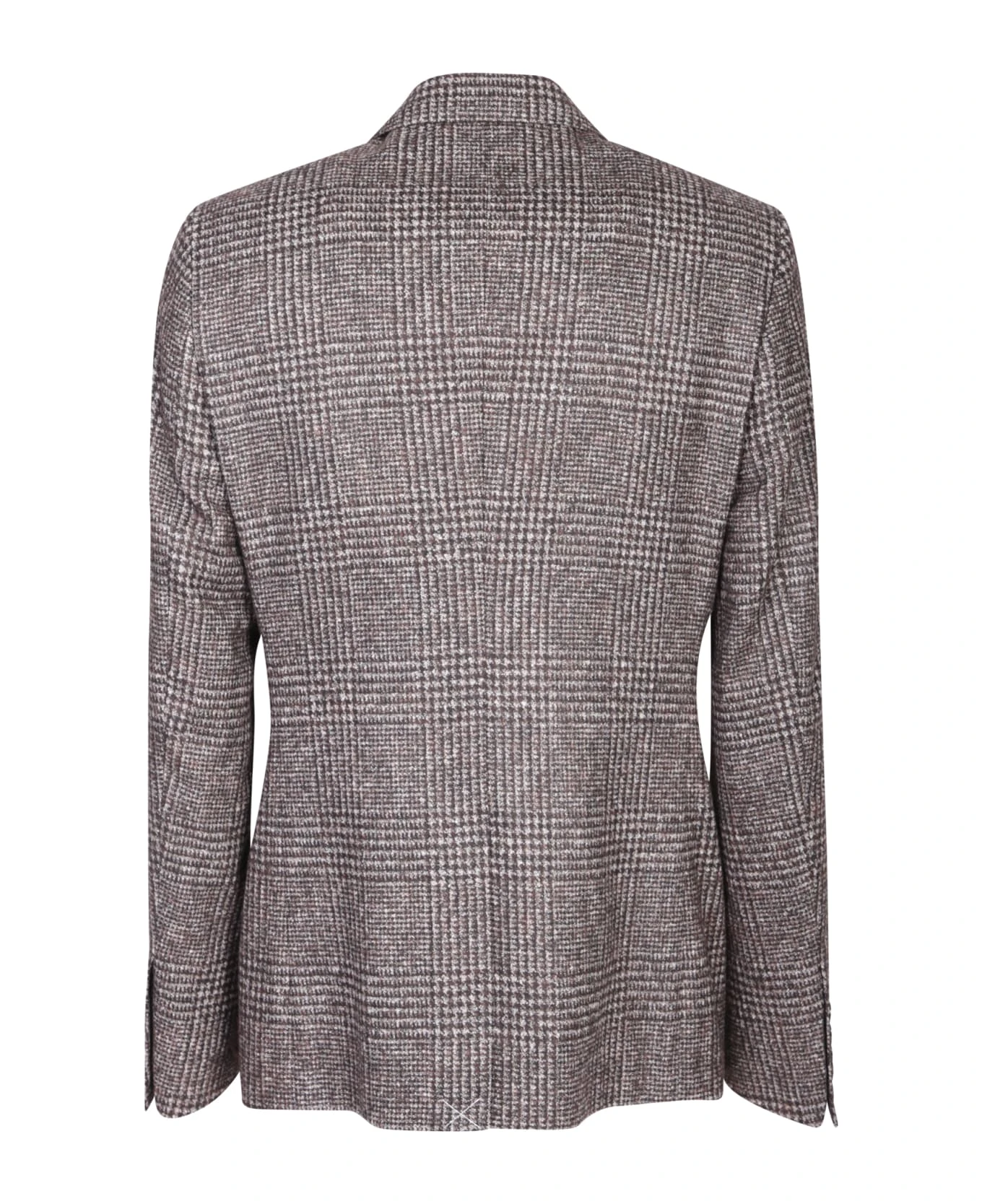 Notched lapels. Long sleeves. Front button fastening. Prince of Wales check pattern. Two front flap pockets. Straight hem. Color: grey