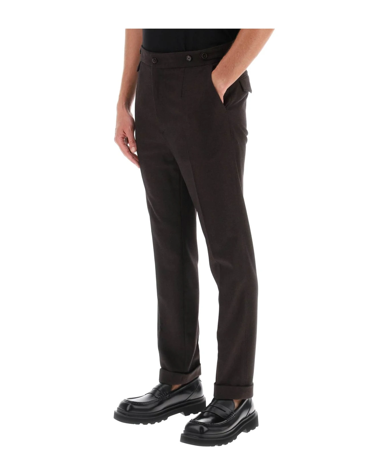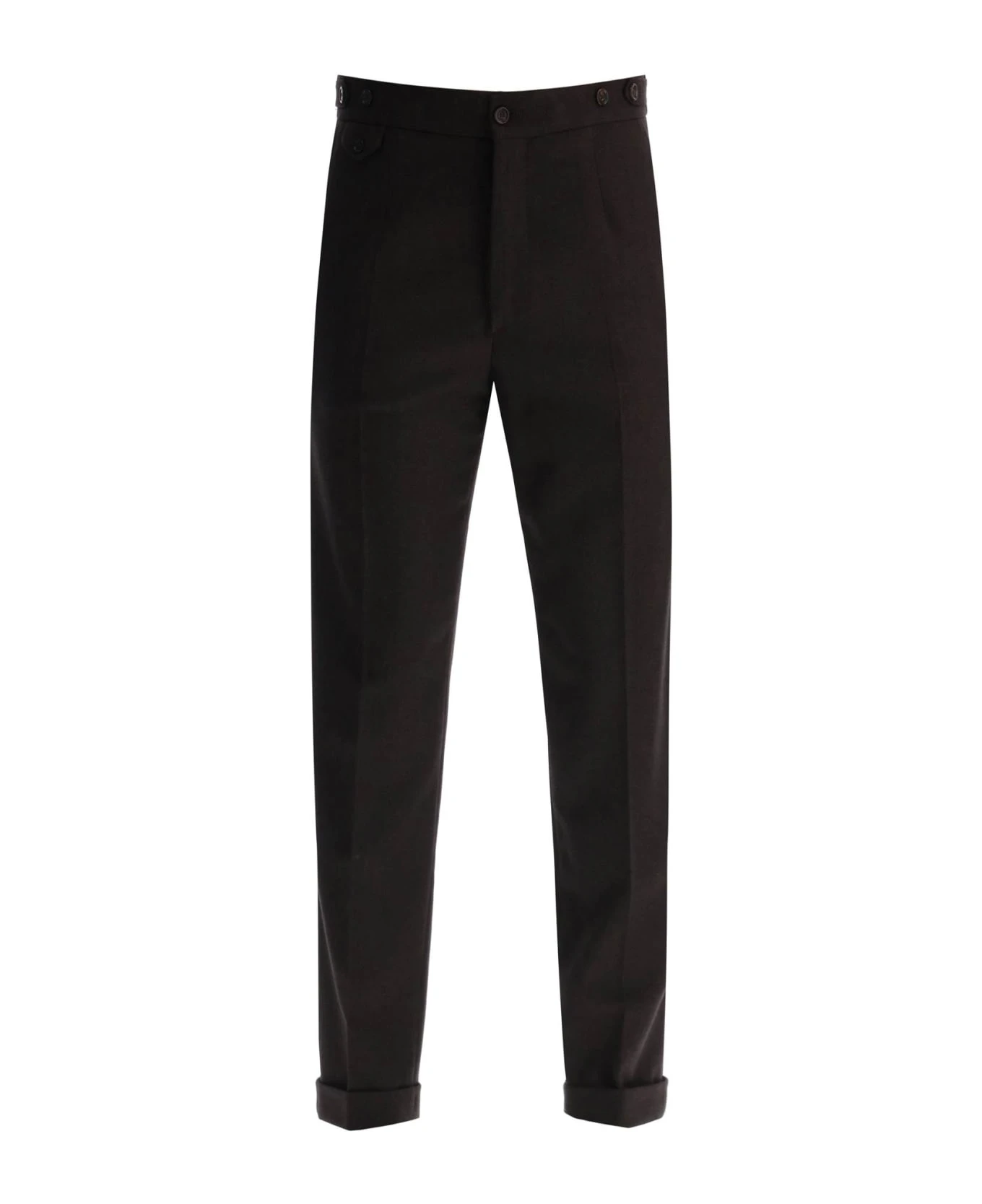 Pants from the Re-Edition collection by Dolce&Gabbana crafted in stretch wool-blend flannel. They feature adjustable waistband with side tabs and buttons, front fastening with zipper fly and buttons, side slash pockets and back welt pockets with flap and hidden button. Enriched by Re-Edition label on the back and watch pocket on the waist. Slim fit with tapered cut and pressed crease. The model is 187 cm tall and wears size IT 48.