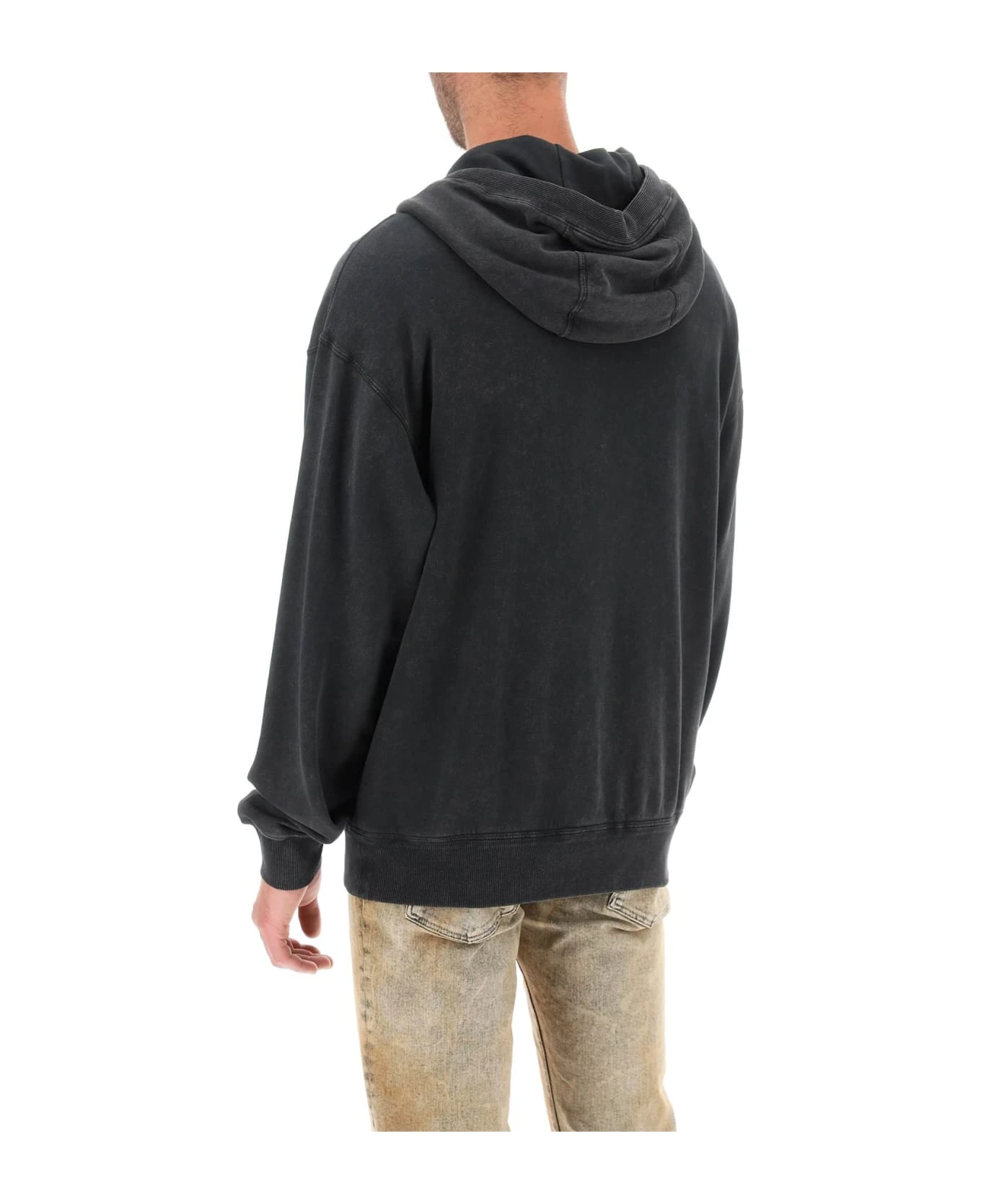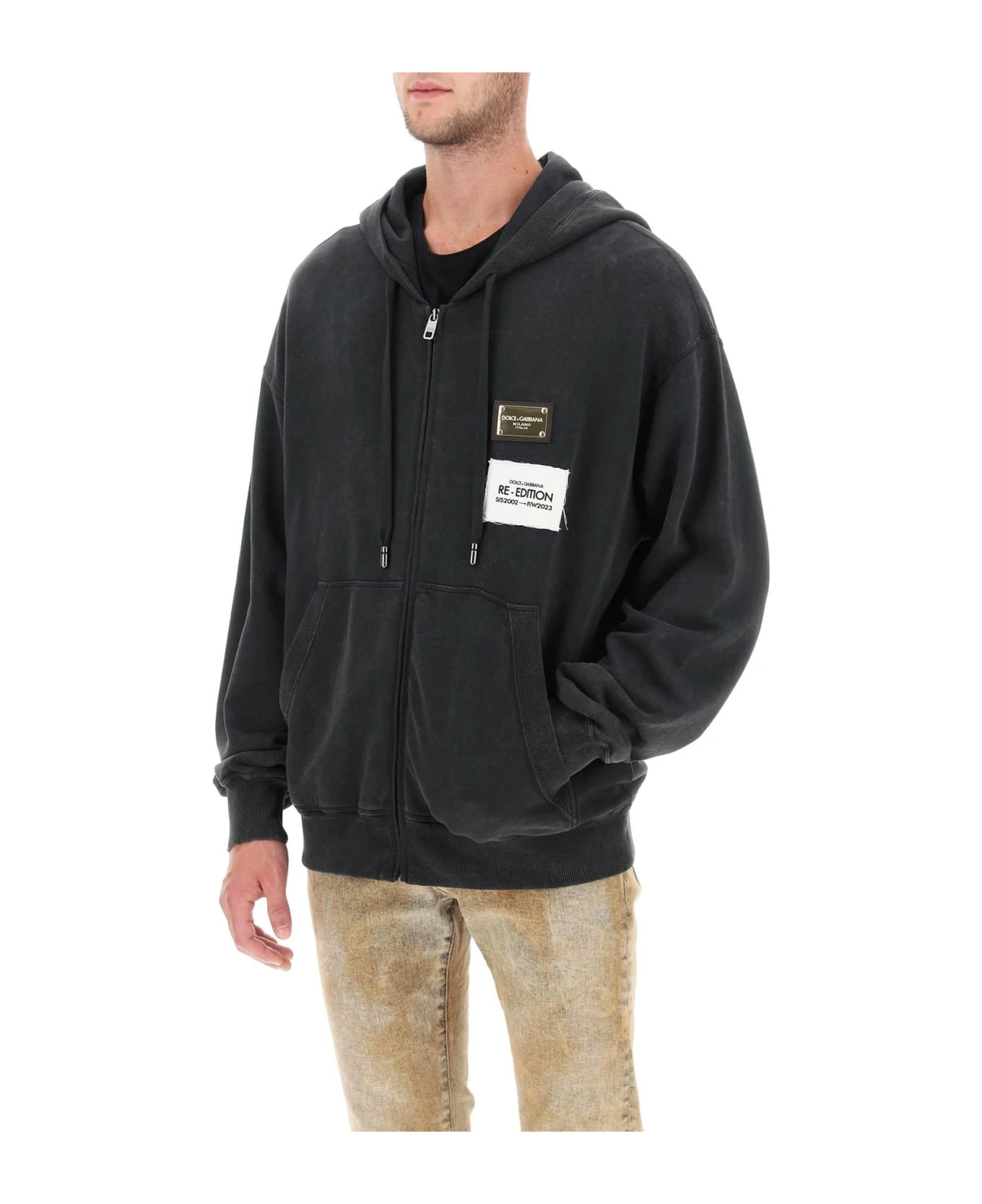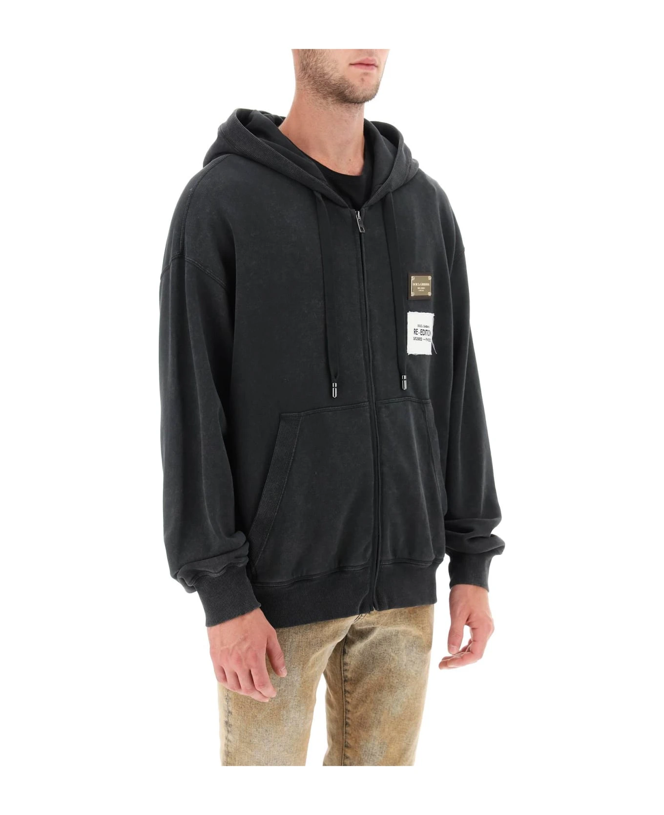 Sweatshirt from the Re-Edition collection by Dolce&Gabbana crafted in washed cotton french terry. It features adjustable hood with drawstring, zipper fastening, front split kangaroo pocket and ribbed trims. Embellished with gold-tone metal logo plaque and Re-Edition label at chest. Loose fit with low-set sleeves. The model is 187 cm tall and wears size IT 48.