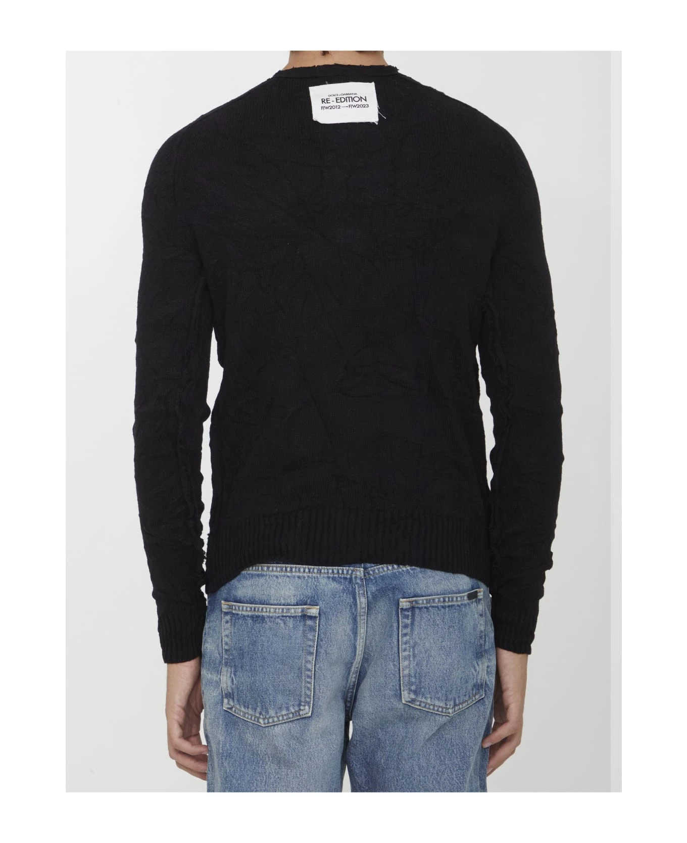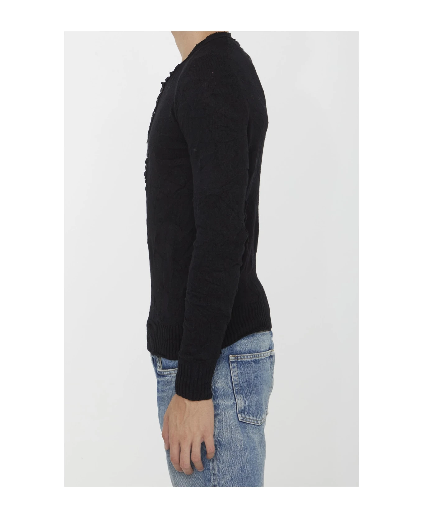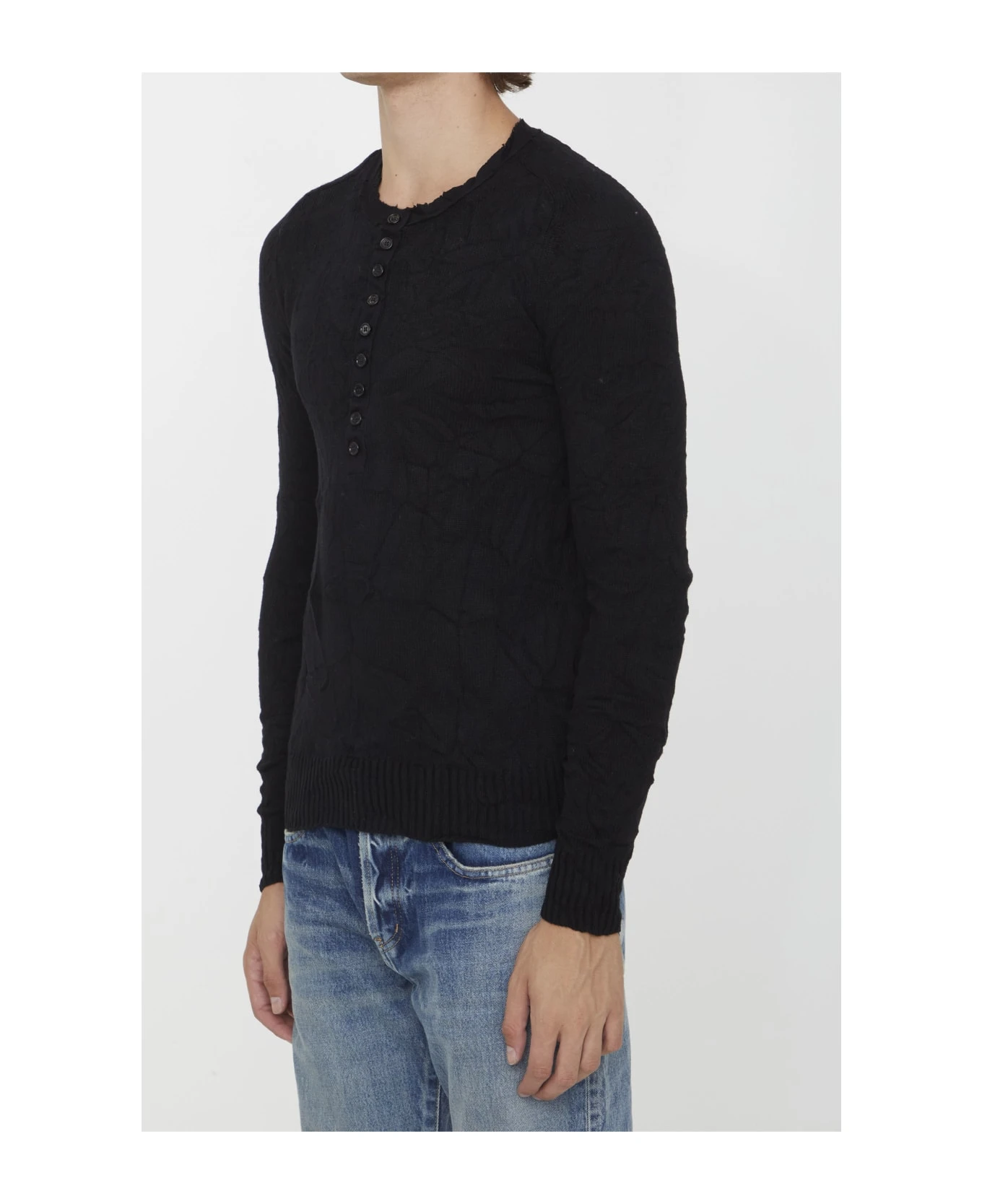 Long-sleeved crewneck jumper in crinkled-effect black wool with Re-Edition patch at the back of the neck. Front buttoned placket. Ribbed cuffs and hem. Tight fit.