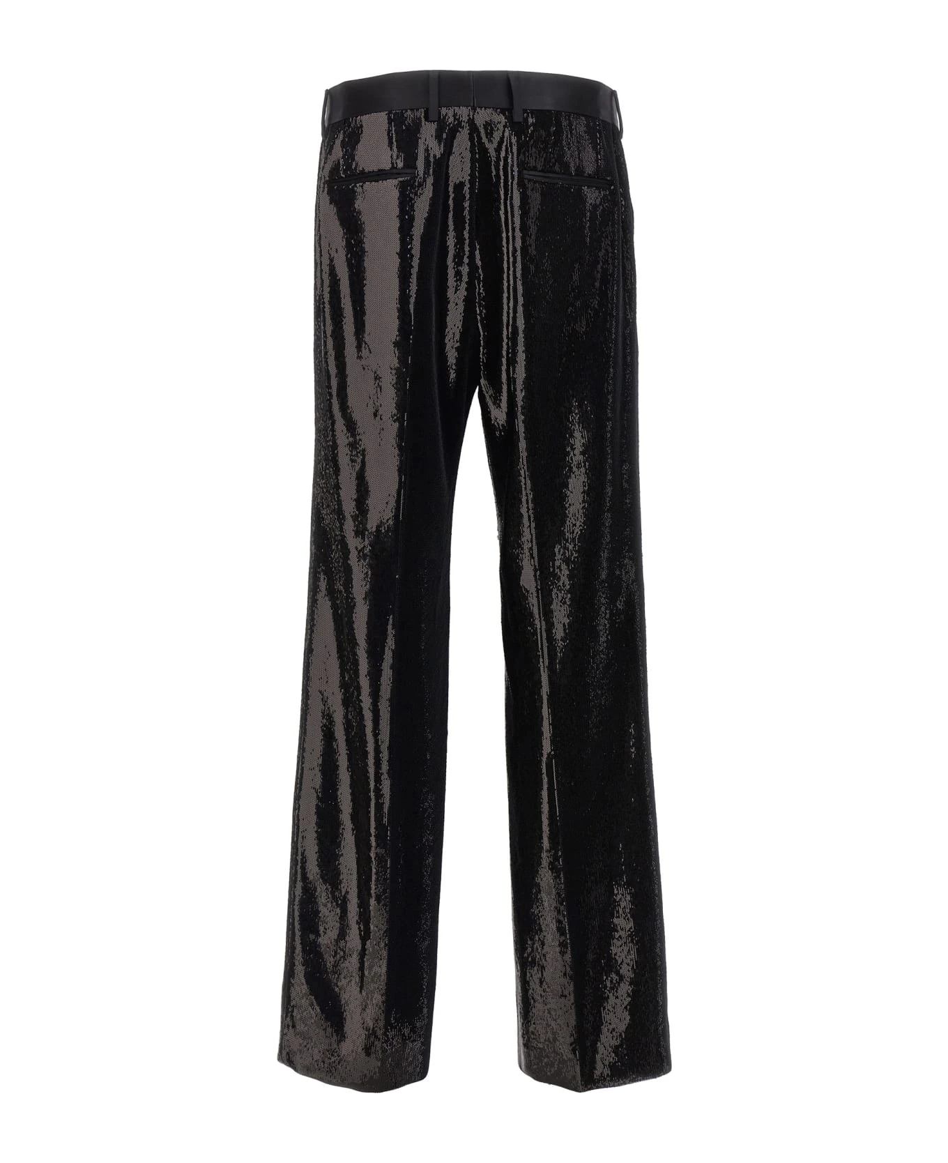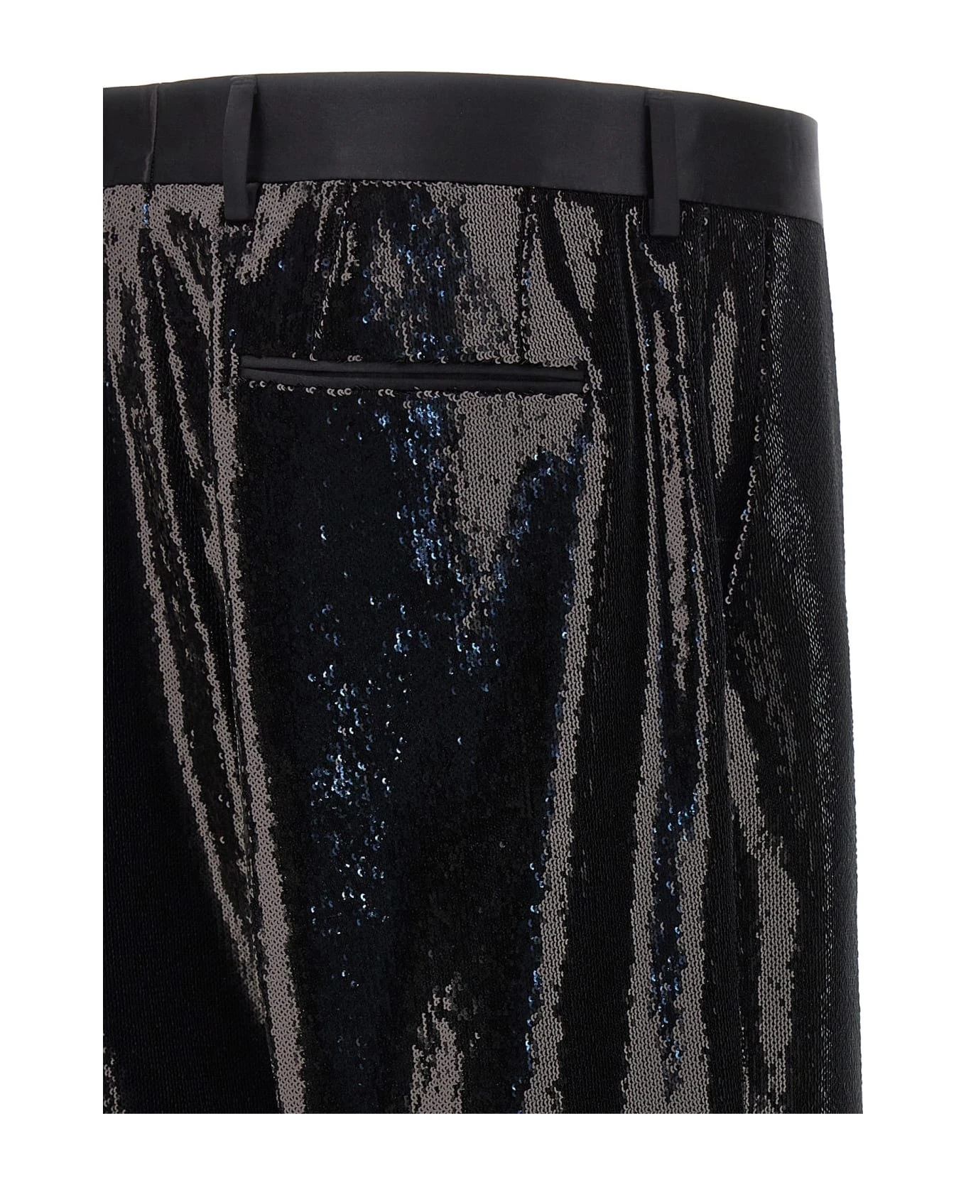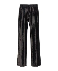 Tailored pants with sequin application, zip and button closure, pockets.