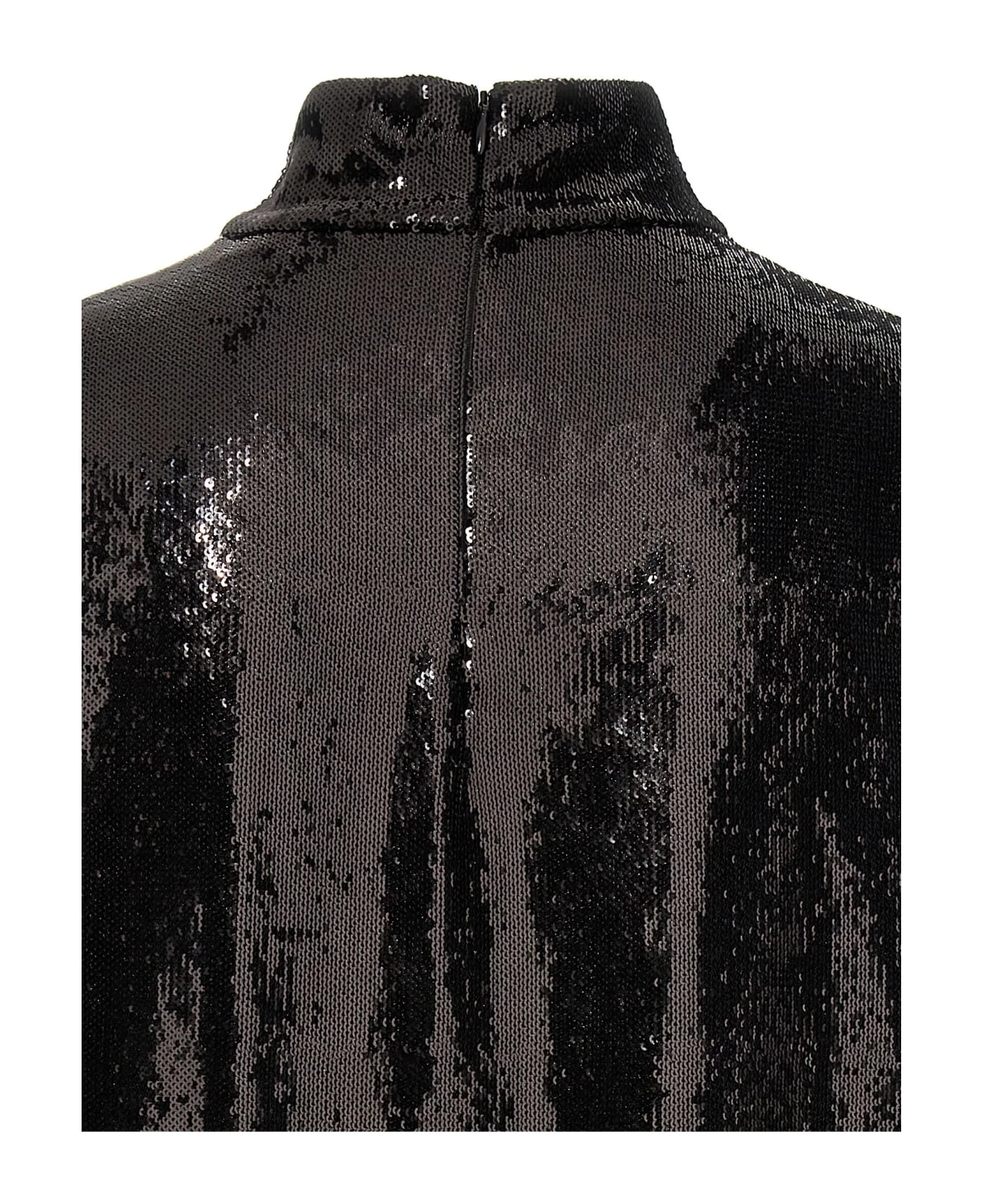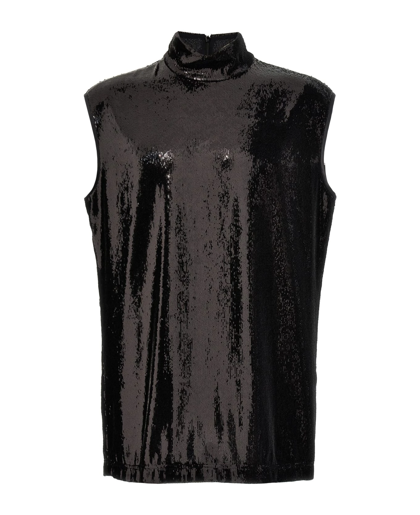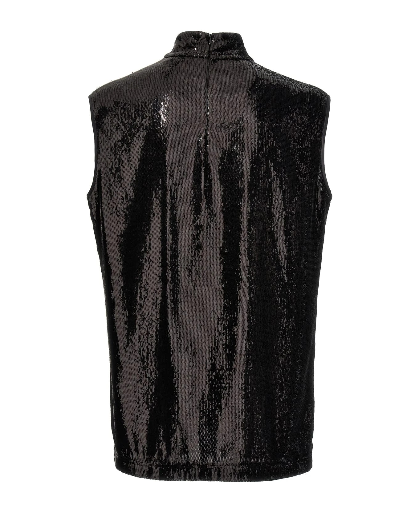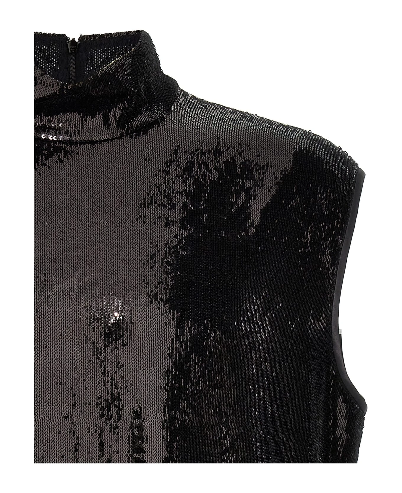 All-over sequin top, high neck, sleeveless, back zip closure, sleeveless.