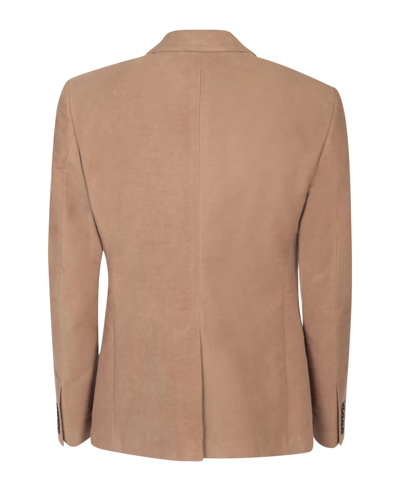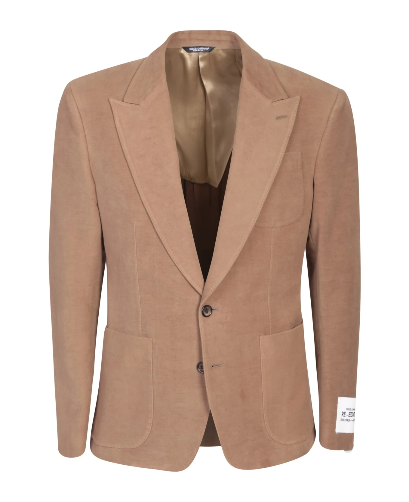 Peak lapels. Long sleeves. Single breasted button fastening. Three front pouch pockets. Straight hem. Color: brown