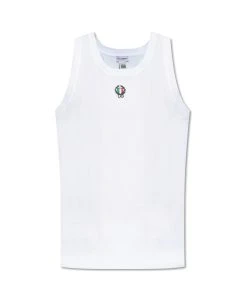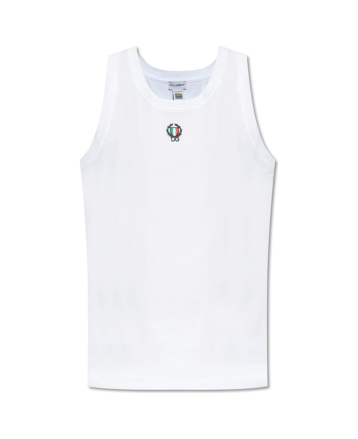 White sleeveless T-shirt from Dolce & Gabbana, the ‘Underwear’ line. This creweck design is decorated with a multicolored embroidered logo pattern.