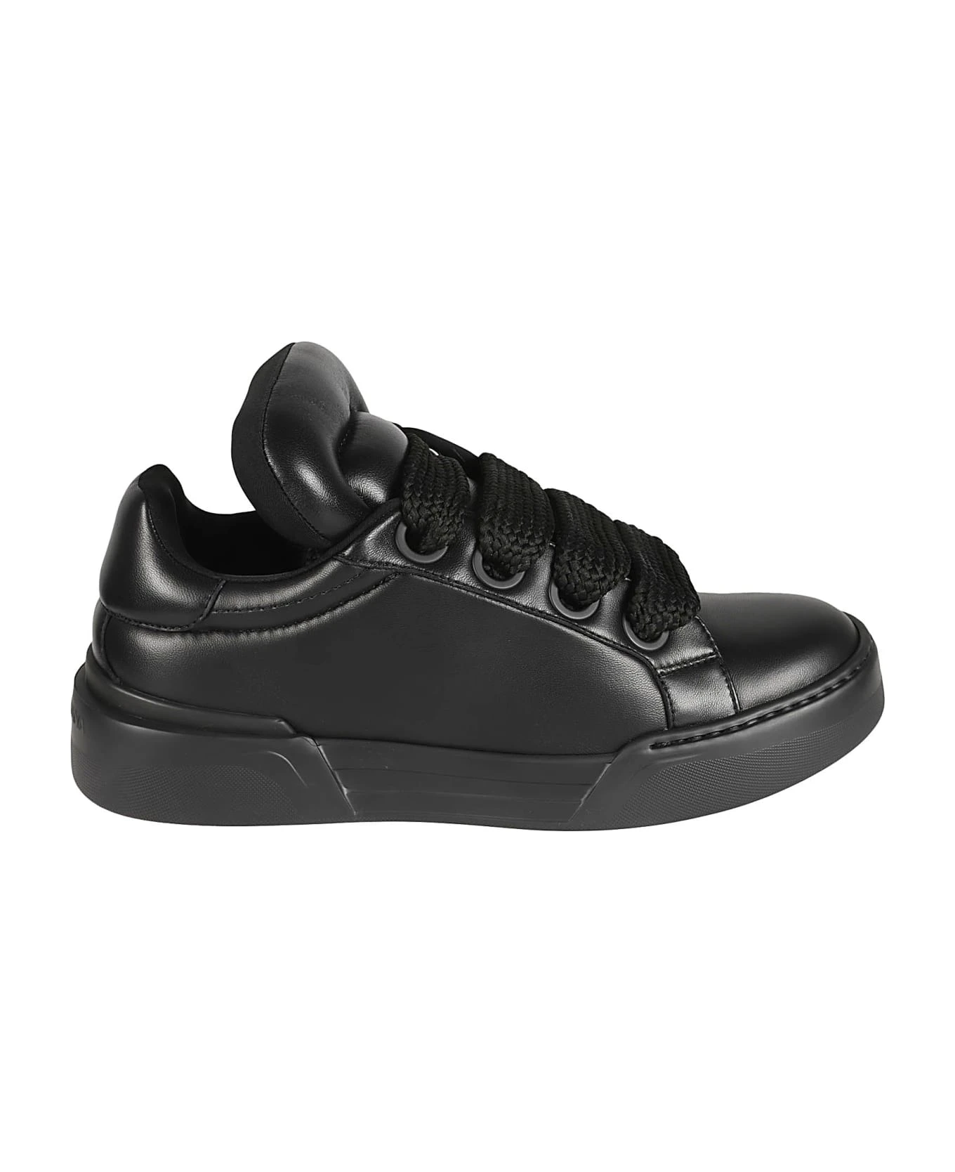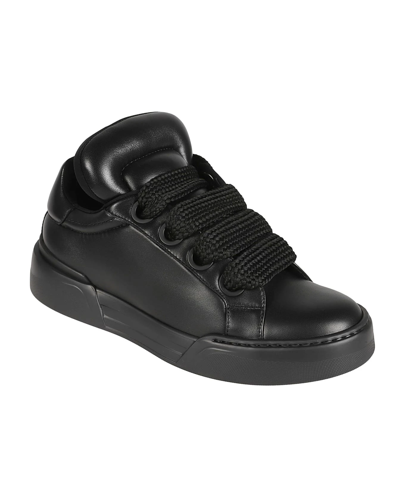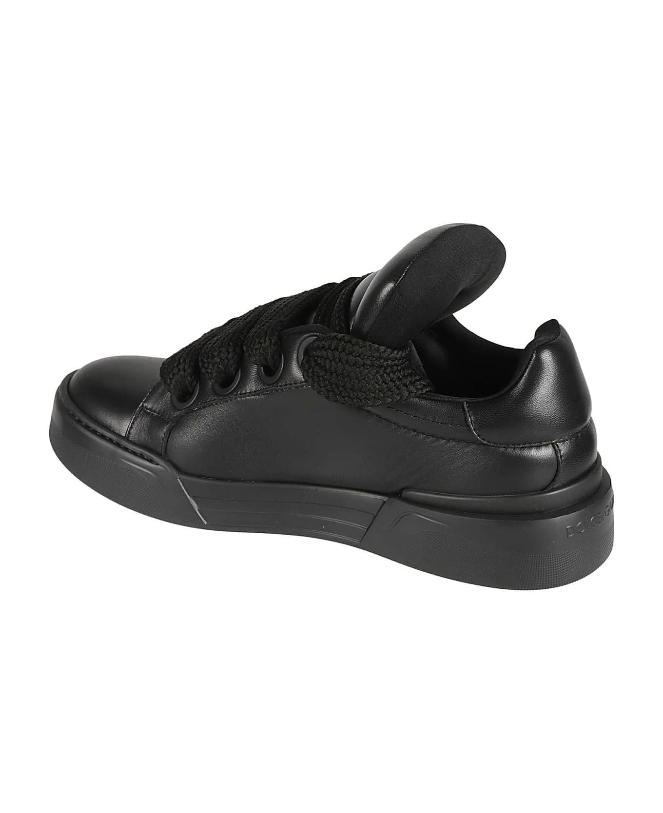 Portofino low-top sneakers from DOLCE & GABBANA featuring black, calf leather, round toe, oversize tongue, front lace-up fastening, branded insole and flat rubber sole.