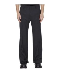 Straight-leg trousers in grey stretch flannel. It features zip and button closure, two side welt pockets, two rear buttoned welt pockets and belt loops. Regular fit.