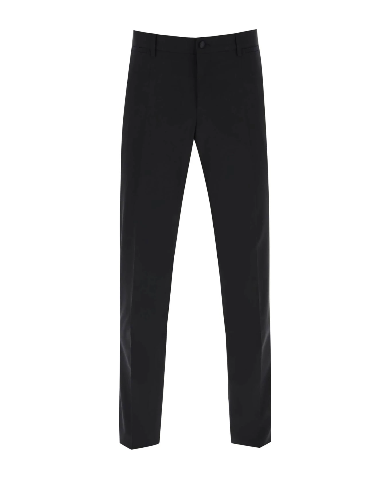 Dolce & Gabbana tuxedo trousers styled in a trim silhouette with pressed crease. Tailored from stretch wool, this style is finished with tonal silk satin side bands and detailing, and features side slash pockets and jetted back pockets with button. Belt loops, zip fly with button fastening. They come unhemmed to allow further tailoring. The model is 187 cm tall and wears a size IT 48.