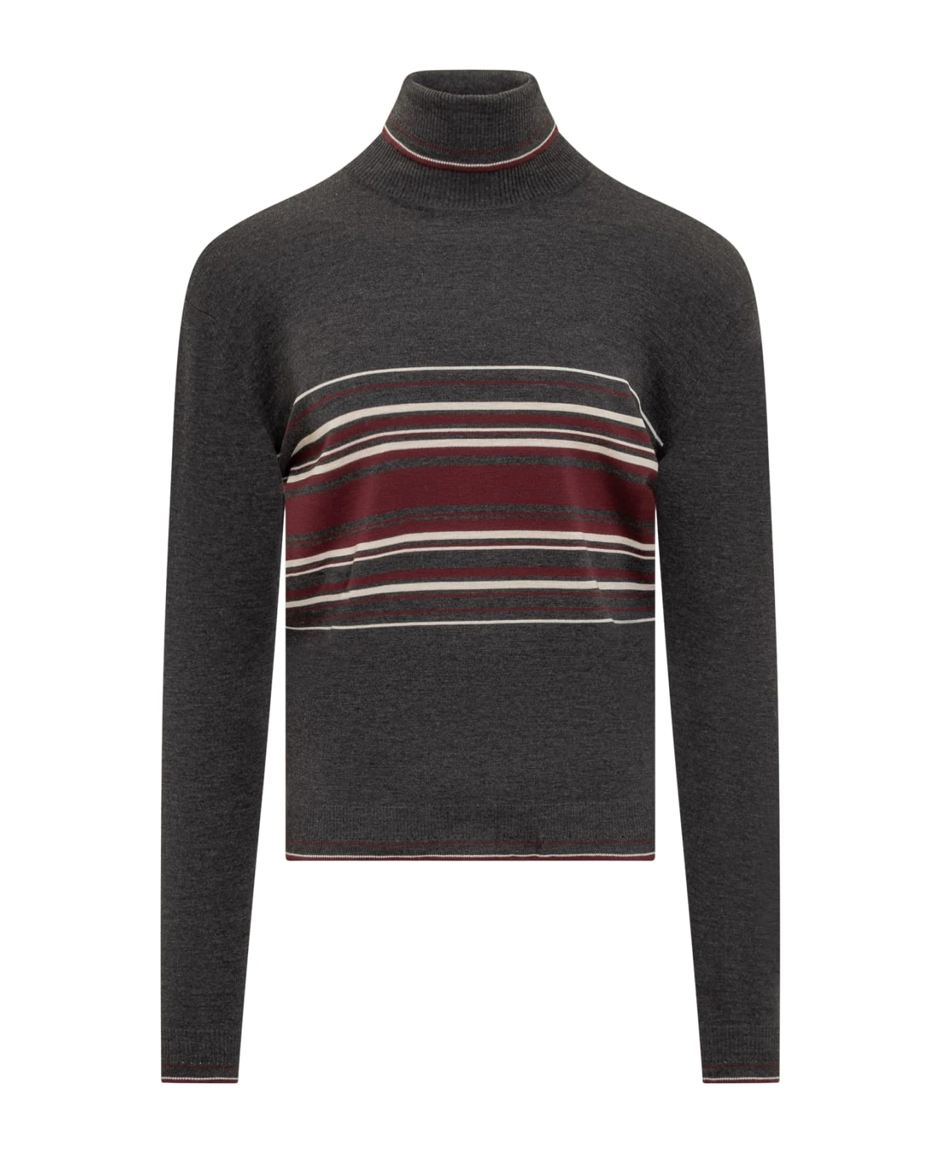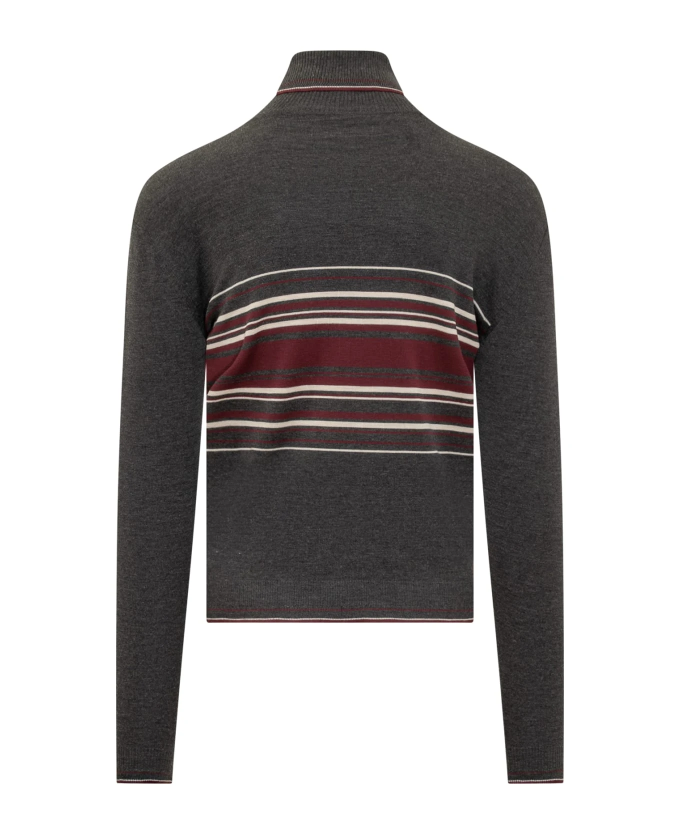 Black pullover with long sleeves. Turtleneck. Striped pattern. Ribbed collar, cuffs and bottom.