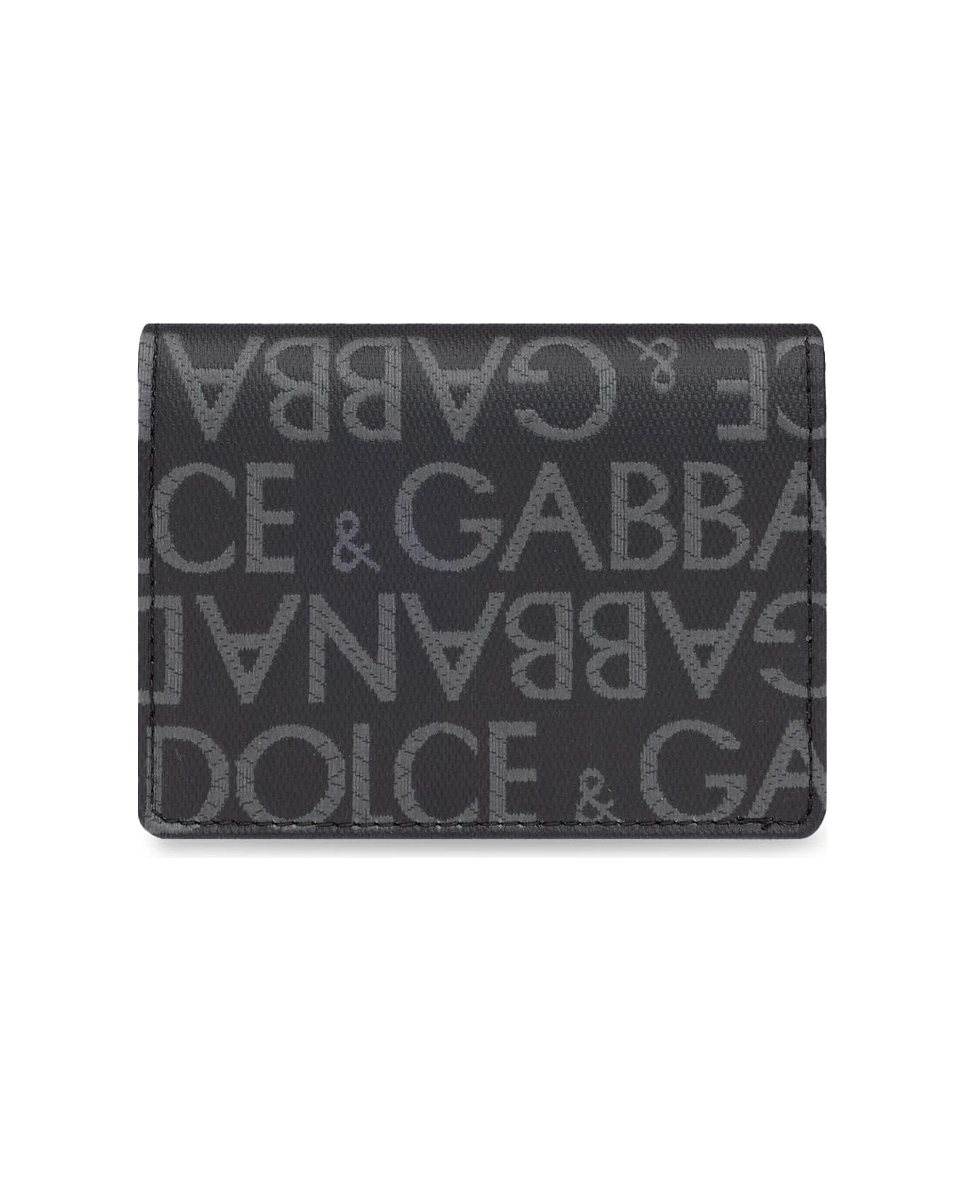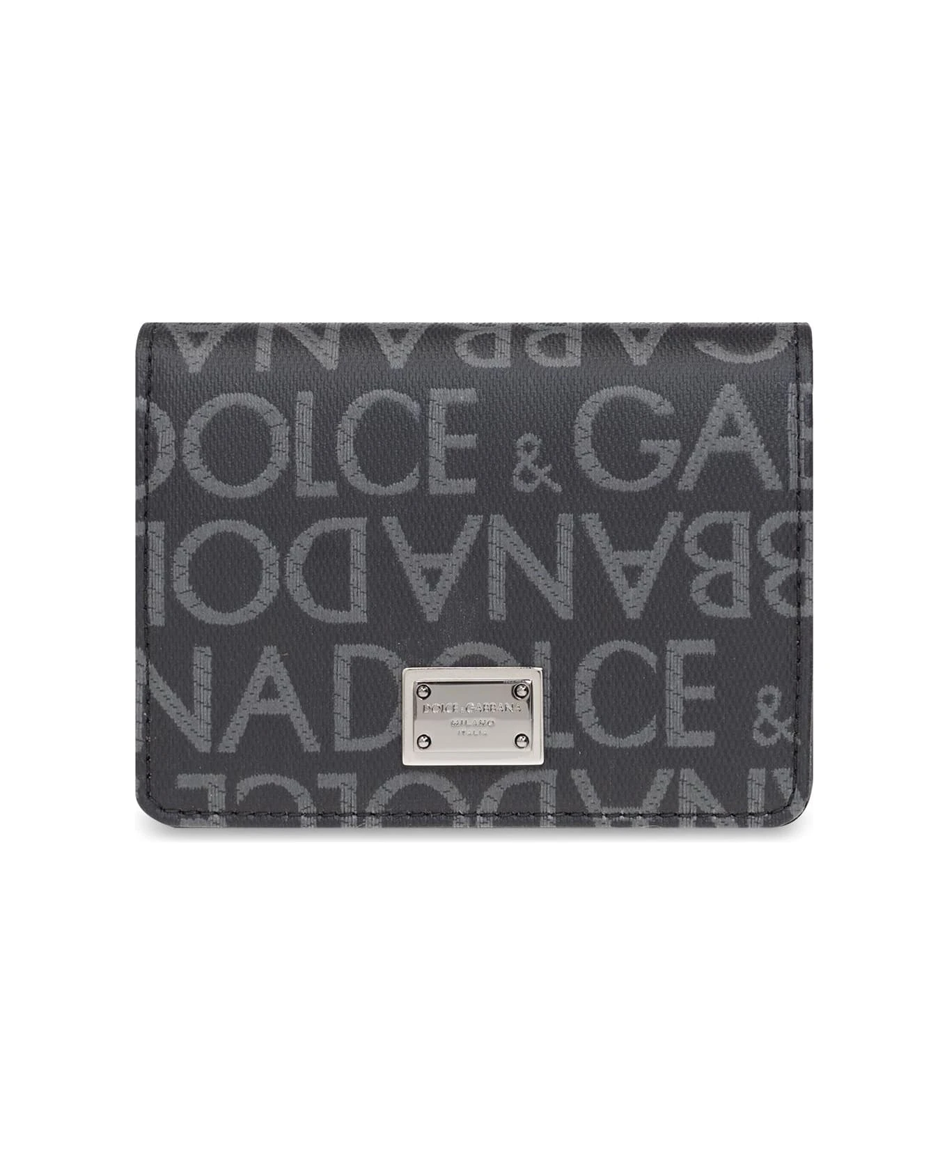 Black and grey wallet from Dolce & Gabbana. Crafted from faux leather, this design features a logo pattern, silver-tone metal hardware and one internal compartment with two card slots.