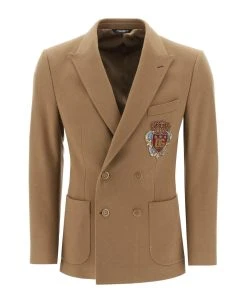 Double-breasted jacket by Dolce & Gabbana made of wool and cashmere decorated with logo patch on the chest. Features welt breast pocket, hip patch pockets and buttoned cuffs. Silk-lined interior with two welt pockets, back slit and regular fit. The model is 187 cm tall and wears size IT 48.